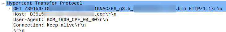 Why not just install a vulnerable firmware version (this one), get a root shell and, after that, force a firmware upgrade and grab the new firmware image? There's no need to wait for TR-069 on 7547 if you force a firmware upgrade via the reset button. So after grabbing a compiled MIPS tcpdump bin and force the upgrade a few times, I catched a fresh firmware image requested to the ISP's CDN: