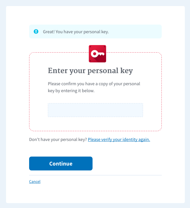 3). Click 'I have my personal key' on the reactivate account screen