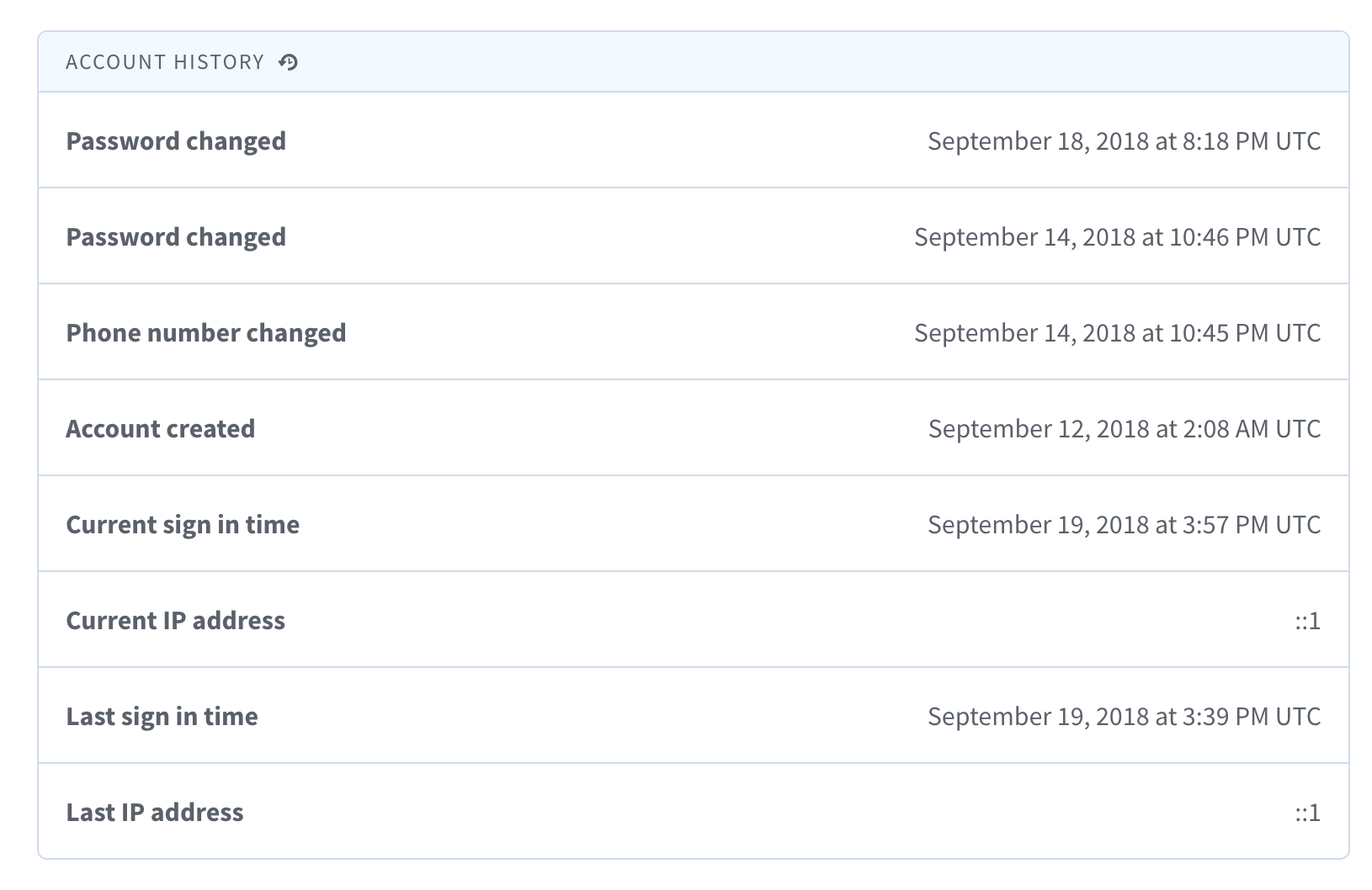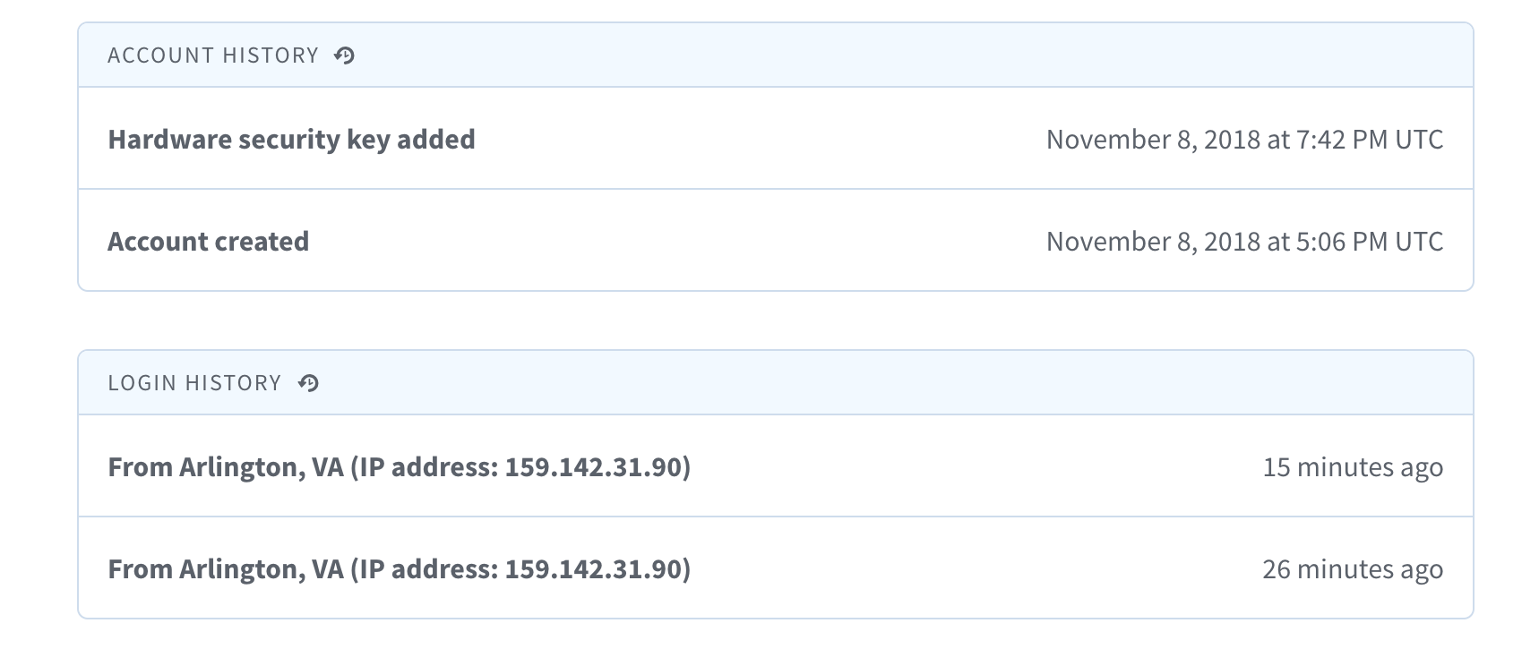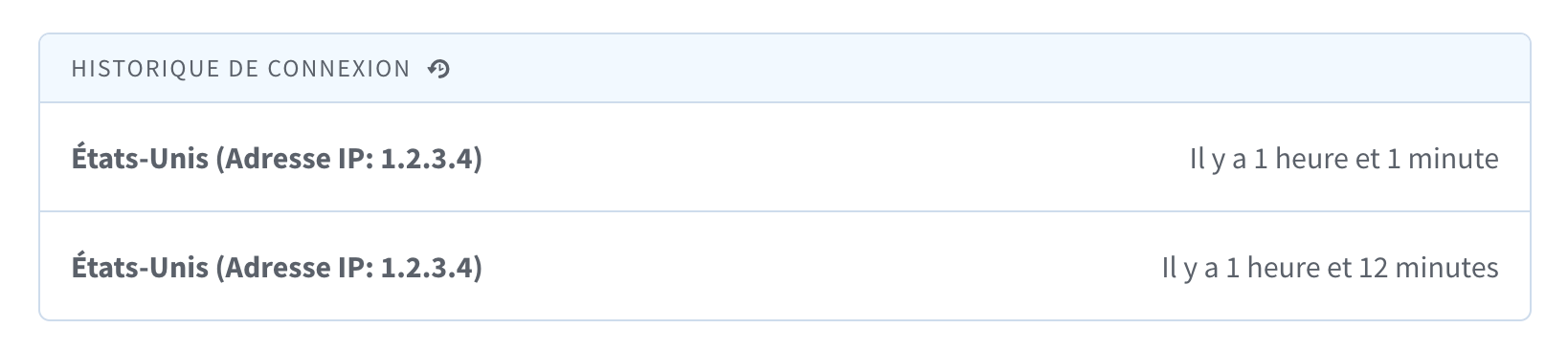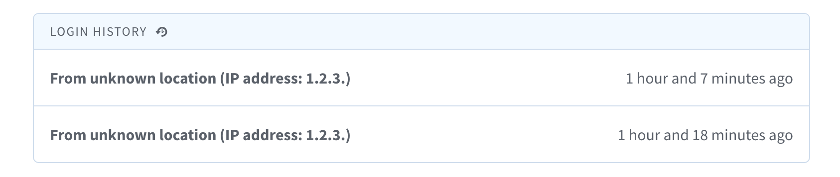 @donjo Here is an updated screenshot: I created a new Login History section that can be sorted independently of the other account events. Currently, we don't record the user agent in the DB when the user signs in, so for now, we only show IP and location. In a future PR, I will introduce a new table that will capture user agent, IP and timestamp for each login. Here is the Spanish version: I dropped the preposition for French because it's not always "de" depending on the location. If either city or state are missing, we only show the country. If no location is available, we show "unknown location": Thoughts? |