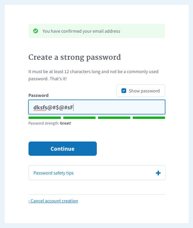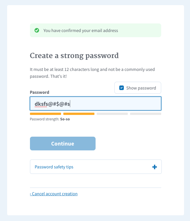 Why: It is confusing for the user to see the password strength meter green but the button is still disabled because the password is less than 12 characters.
