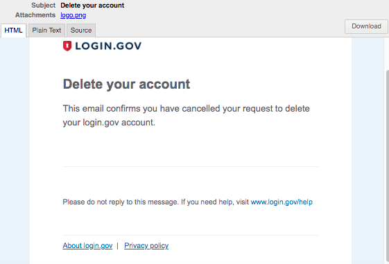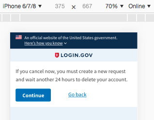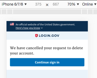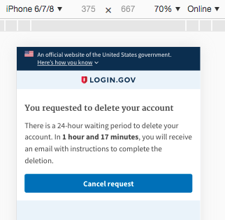 @porta-antiporta this PR does not include changes to the SMS that's sent on account deletion requests as well? For this PR, we only send an email to the user. We don't send an SMS because of the case where the user has lost their phone and thus changed numbers. @Danielle-Lee thanks for your feedback on the verbiage. I'm still concerned with screens 2 and 3, because the user has already started the sign-in process. As I read your suggested verbiage, it makes me feel like I'm starting from scratch. On screen 2 I'm told I can sign in on the next screen, but you actually can't. You can only click on another button to sign in. On screen 3, the button reads "Sign in", but I already signed in (I only got to these screens by providing my username and password). I think adding "Continue" will make it clear to the user that he/she is not starting something over. With this in mind, I the text on screen 2 could be reduced to: and screen 3 could acknowledge and cancel and the button could read "Continue Sign In" or "Continue authentication" I'm having difficulty editing the Google Draw document; hopefully these comments are clear. |