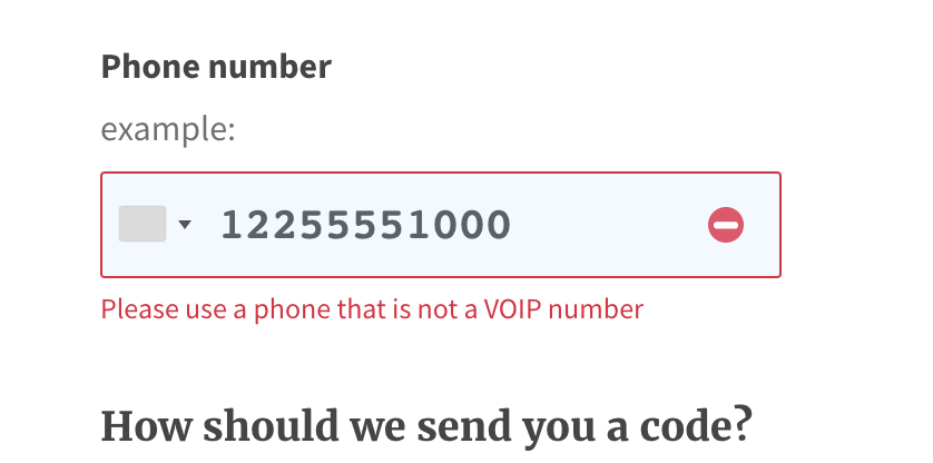 @porta-antiporta, @zachmargolis, @TiffanyAndrews, and I synced up on this. We determined we are going to go with this approach where we are disallowing VOIP numbers on phone setup. |