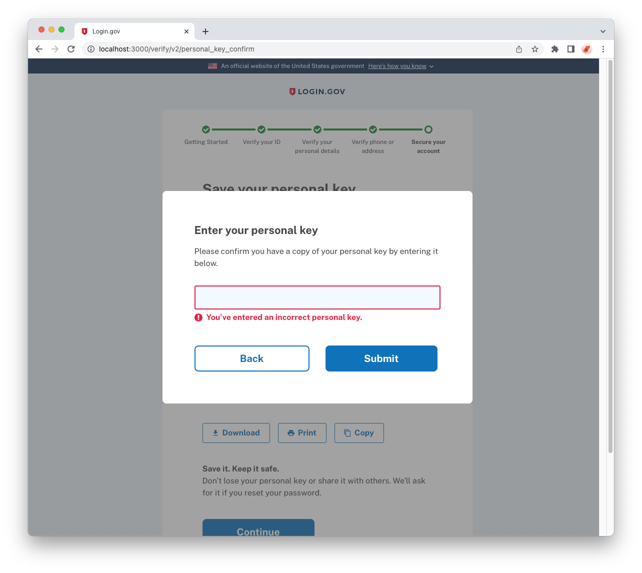 Why: As a user, I expect feedback if I have incorrectly entered the personal key, so that I can correct my mistakes and continue with the proofing flow.