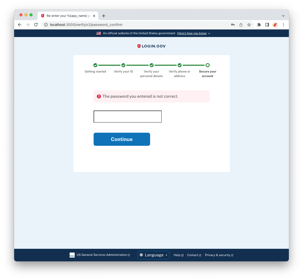 **Why**: So that the user only proceeds to the next step with a valid submission, and so that they know what they need to do to correct the issue. changelog: Upcoming Features, Identity Verification, Add password confirmation step