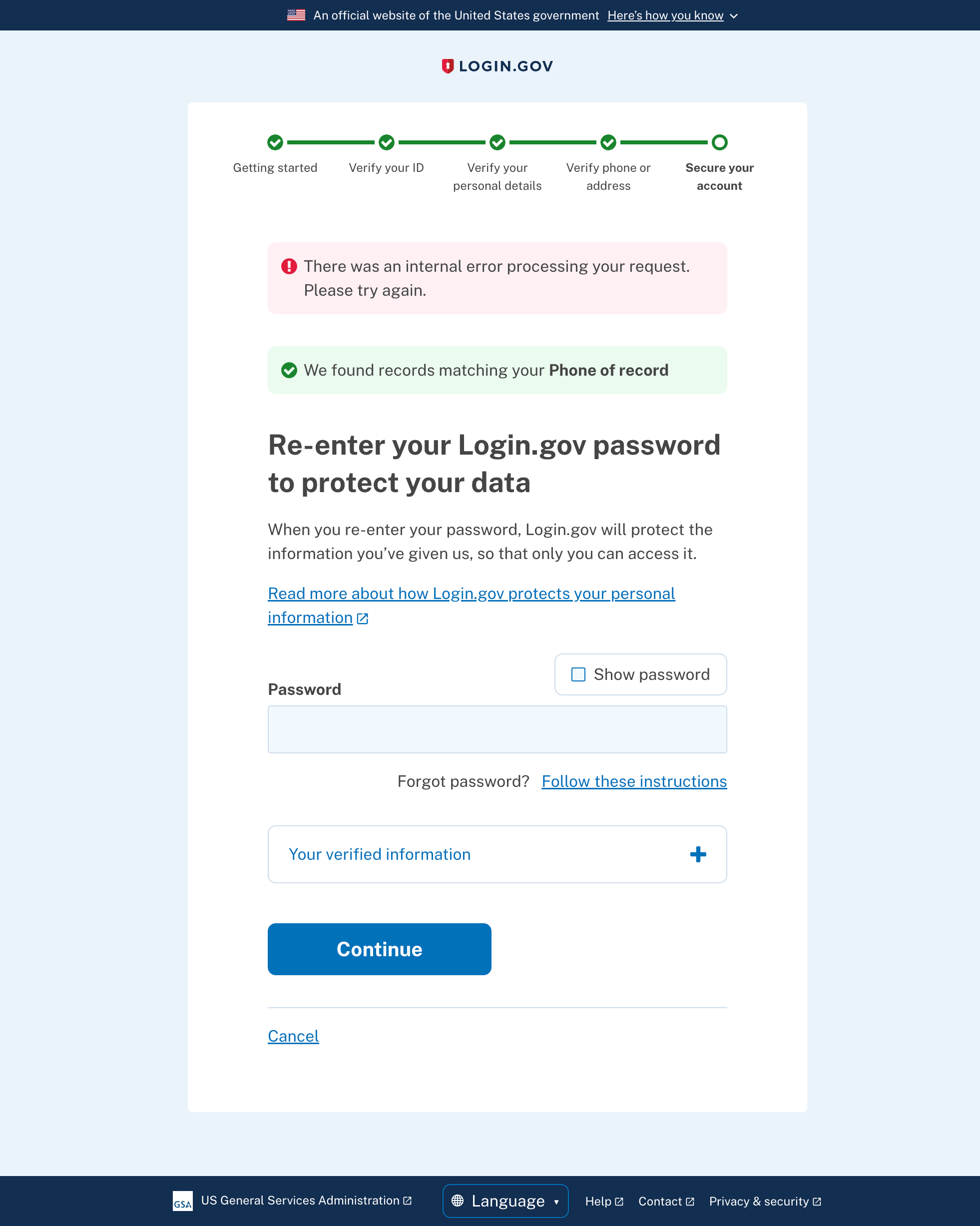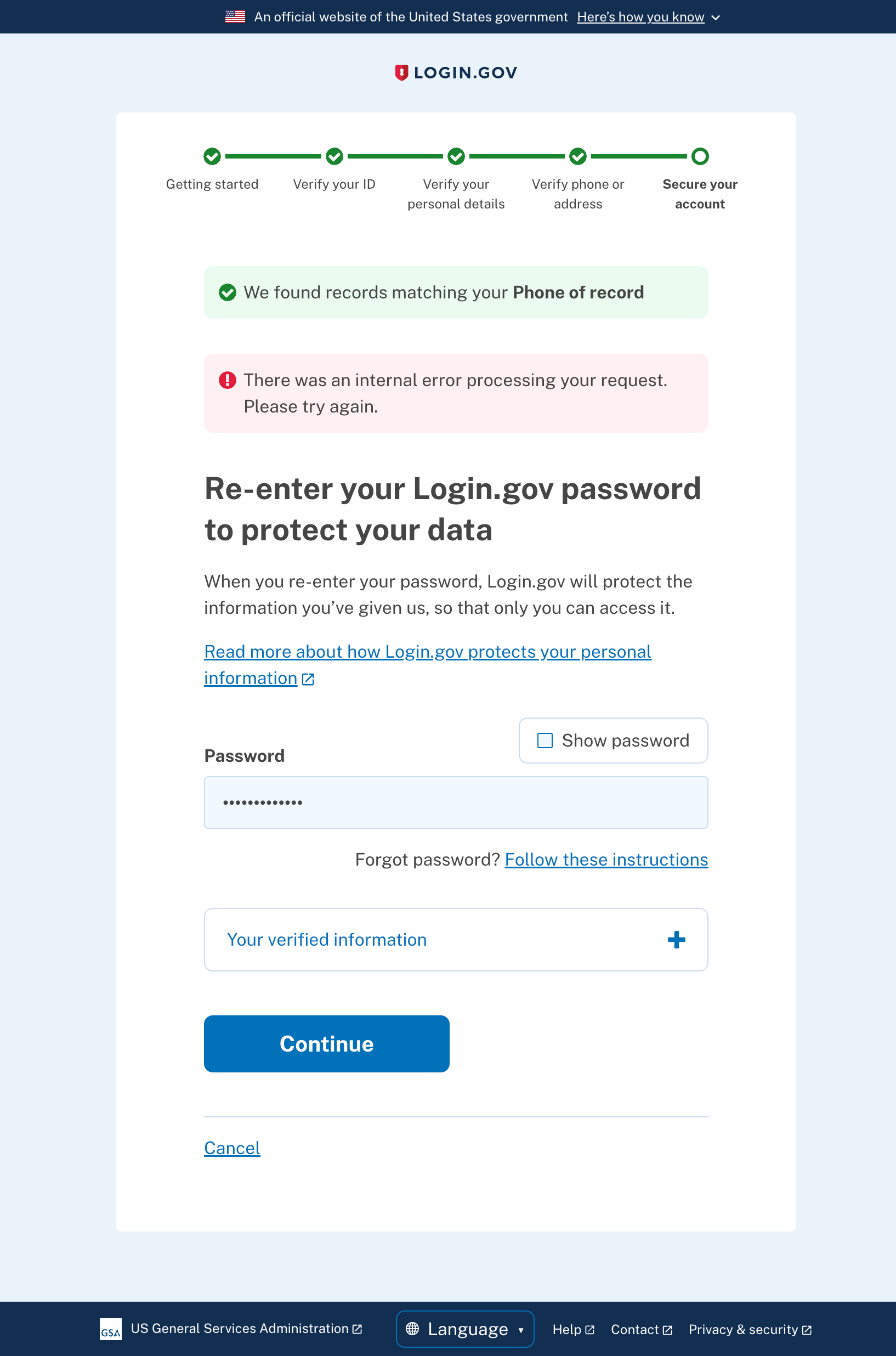 Note: when the user encounters this error the page is reloaded and their password is cleared from the form
