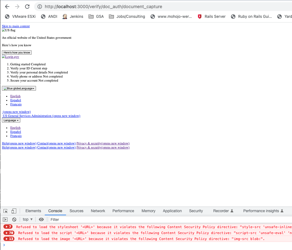 508 tools that rely on javascript execution (ANDI for example) are unable to execute in the development environment due to Content Security Policy (CSP) policies.