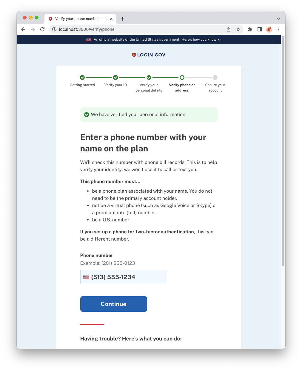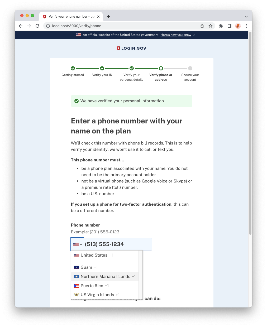 Confirm that you can use a U.S. mainland phone number or a U.S. territory phone number at the "Phone" step of the identity verification flow, and not another international phone number.