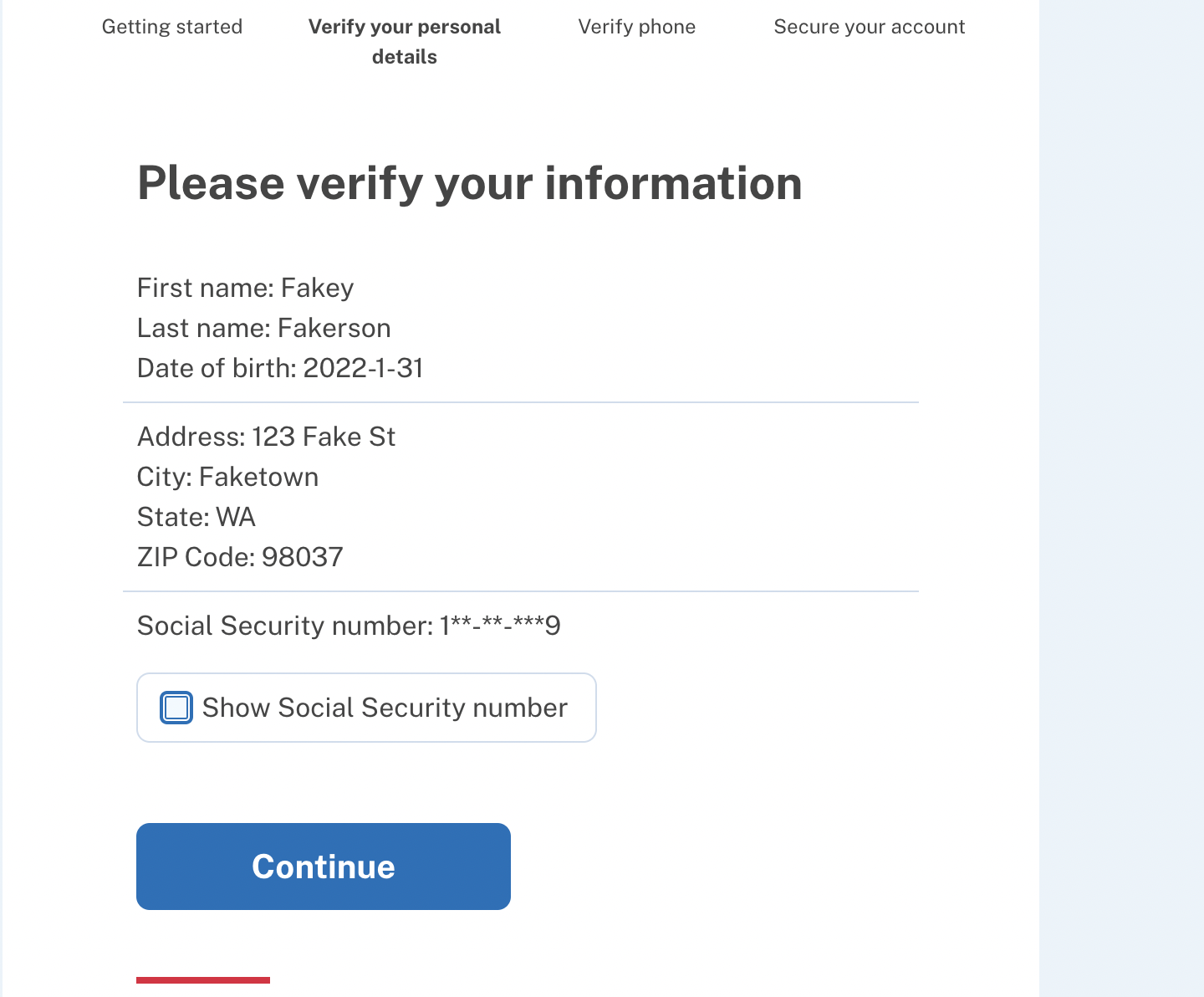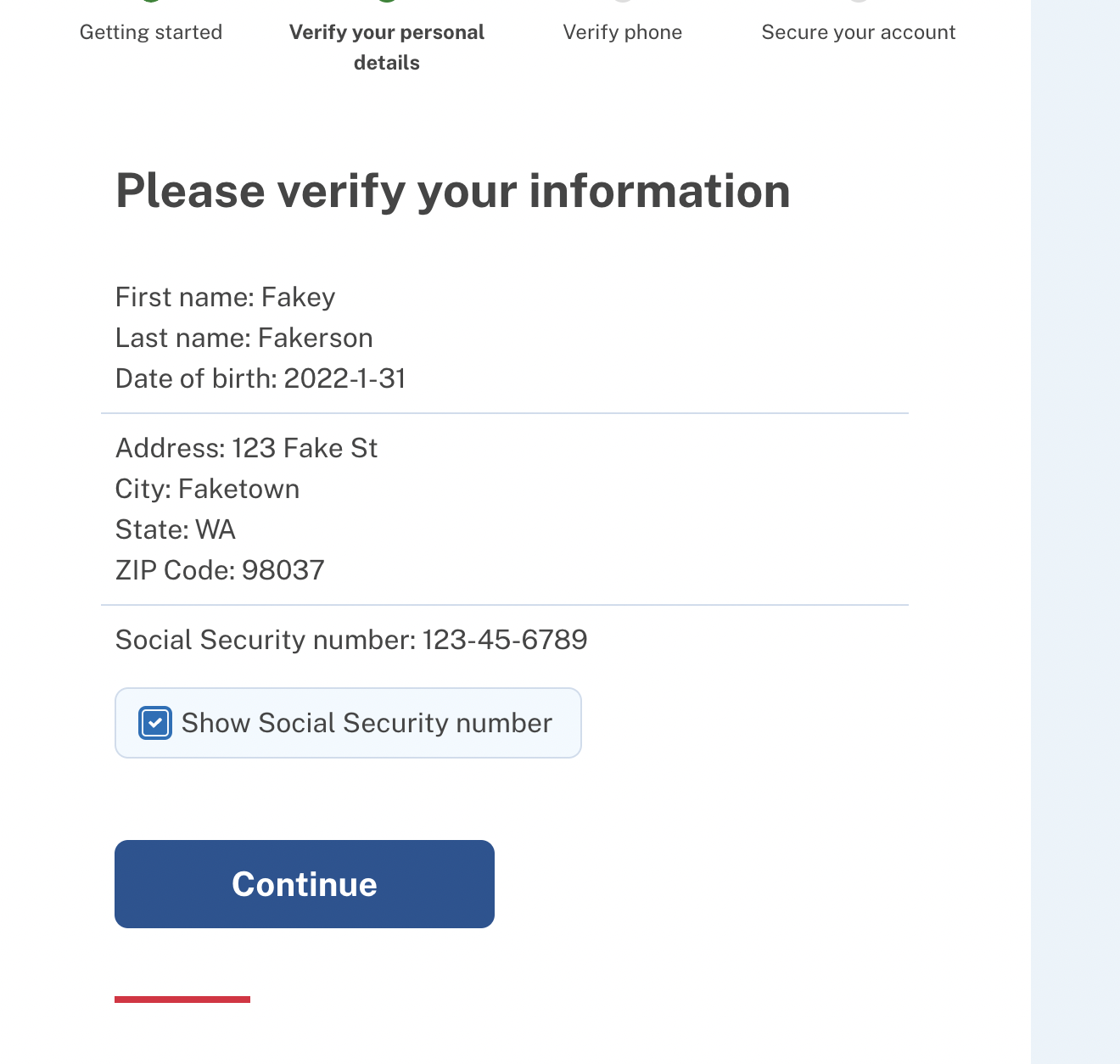 This is an inconsistency/old version I didn't catch earlier, but yes, the title should read "Verify your information" instead of "Please verify your information". And yes, the addresses or SSN are not edited at this time, so I defer to y'all on whatever is easiest with the template.