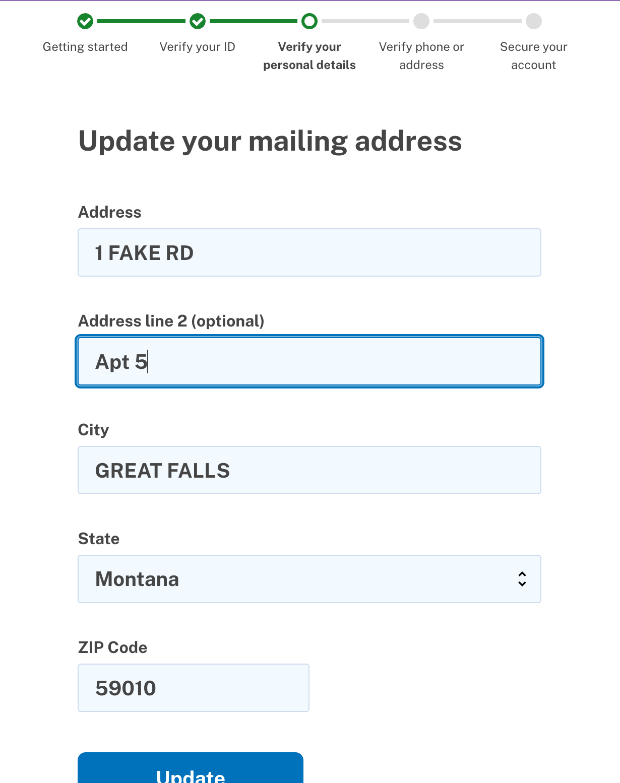 New Update Mailing Address Screen: