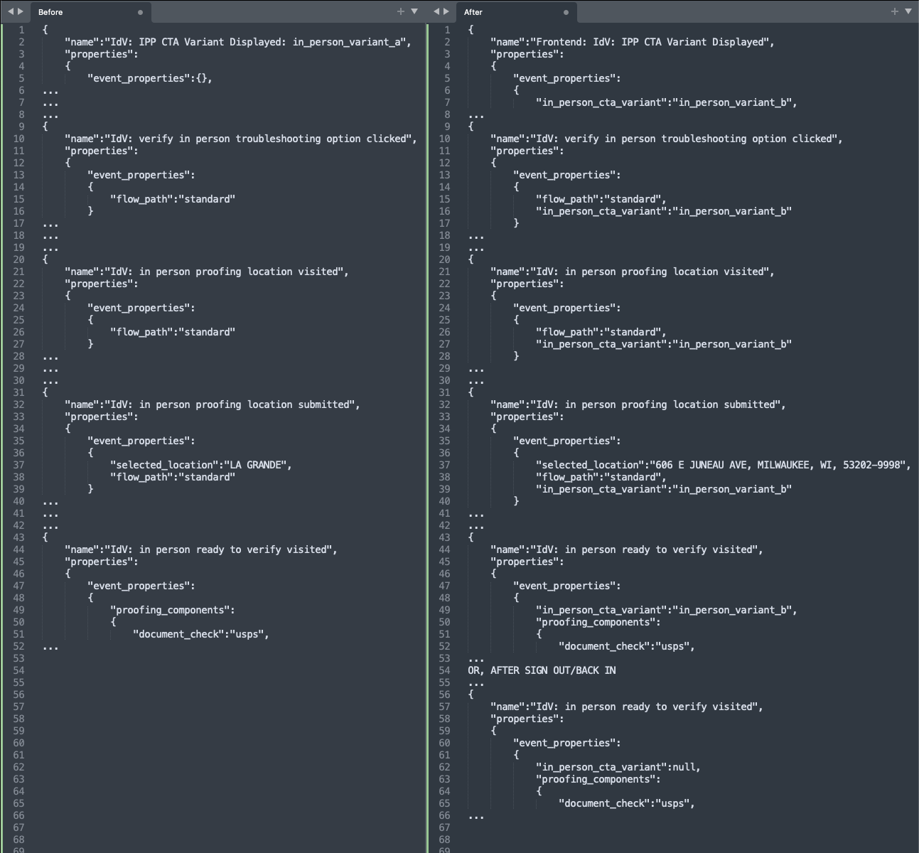 Samples of each of the 5 log events before and after these changes