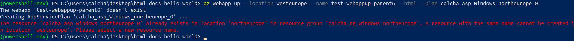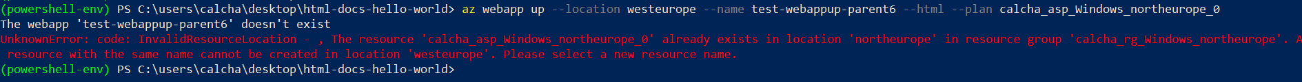 az webapp up --location location1 --name name1az webapp up --location location2 --name name2Should get error message saying ASP exists in different location