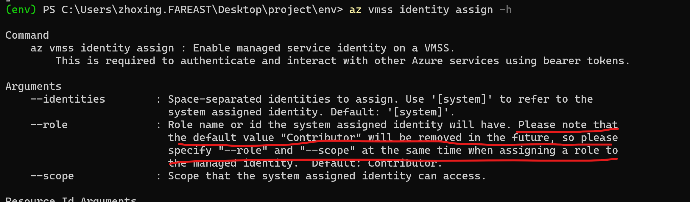 Contributoris too high to be used as the default role foraz vm/vmss identity assign, so the default valueContributorof--rolewill be removed in the future.Therefore, the first step is to prompt users that parameters