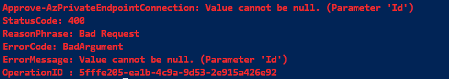 Hello @BethanyZhou, After the release, I tried to execute the Approve-AzPrivateEndpointConnection -ResourceId , but I am getting the below error: Looks like the request is not populated with the id field which is given as "PrivateEndpointConnectionResourceId" in the cmdlet input. Can you please help in debugging this issue? |