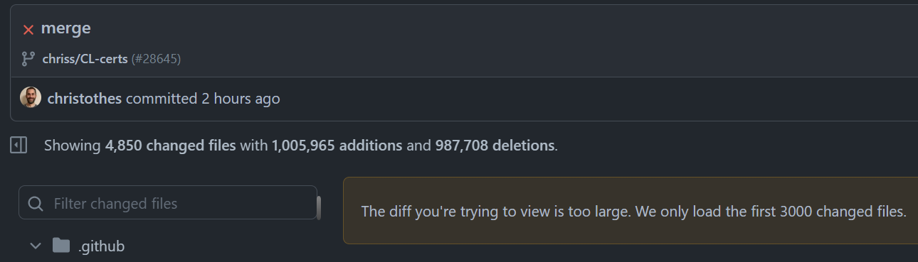Given the merge commit - though GitHub somehow showed a "condensed version" (wonder when they added that nifty little feature) - I'd generally recommend rebasing + force push. Most often GitHub still shows reviewers only subsequent commits. If one were to look at the whole merge commit: I see that often in the specs repo and have them do a rebase instead. |