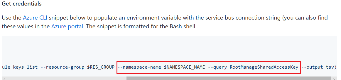 az servicebus namespace authorization-rule keys list --resource-group $RES_GROUP --namespace-name $NAMESPACE_NAME --name RootManageSharedAccessKey --query primaryConnectionString --output tsv