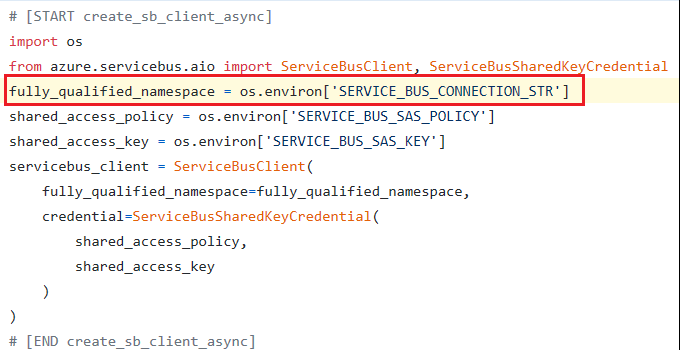 1. azure-servicebus script: [sample_code_servicebus.py](https://github.com/Azure/azure-sdk-for-python/blob/master/sdk/servicebus/azure-servicebus/samples/sync_samples/sample_code_servicebus.py#L35) [sample_code_servicebus_async.py](https://github.com/Azure/azure-sdk-for-python/blob/master/sdk/servicebus/azure-servicebus/samples/async_samples/sample_code_servicebus_async.py#L38)  Suggestion: `fully_qualified_namespace = os.environ['SERVICE_BUS_NAMESPACE']`