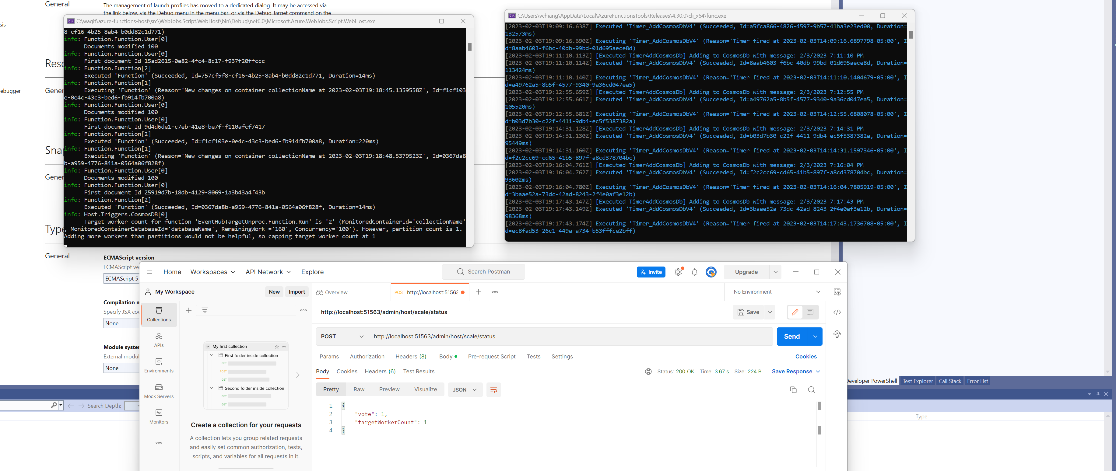 azure-functions-hostrepoScmHostingConfigurations.txtto enable CosmosDB TBSadmin/host/scale/statusAPI using Postman, observe target worker count and localazure-functions-hostlogs emittedScreenshot showing the target scaler requesting a worker count of 2, capped by the partition count which is 1 in this case