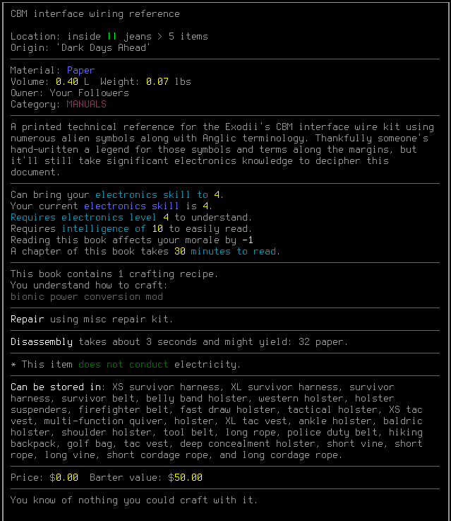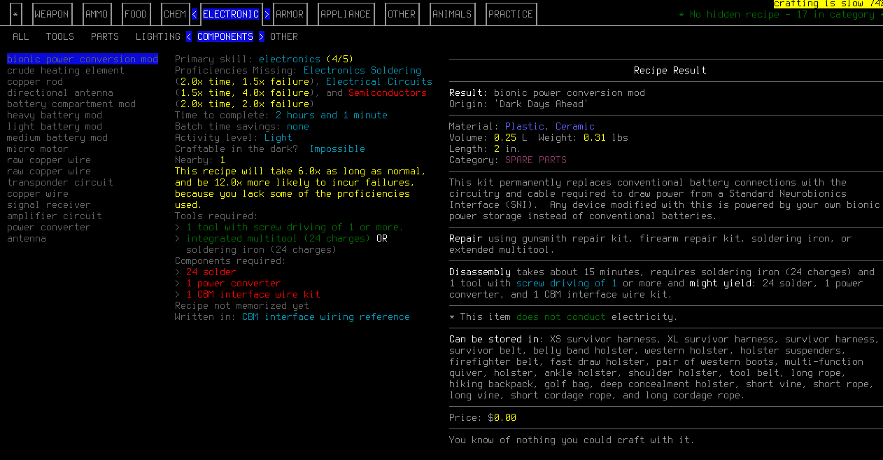 I downloaded and compiled the repo with my single changed C++ line, which resolved (or rather prevents) a bug I observed before I'd made that change. I've manually confirmed Rubik will begin to stock the tech reference and extra wiring kits at 20 favor with the Exodii, and I've made my new recipe then attached it to devices to test that they draw power from my character's bionic power pool.