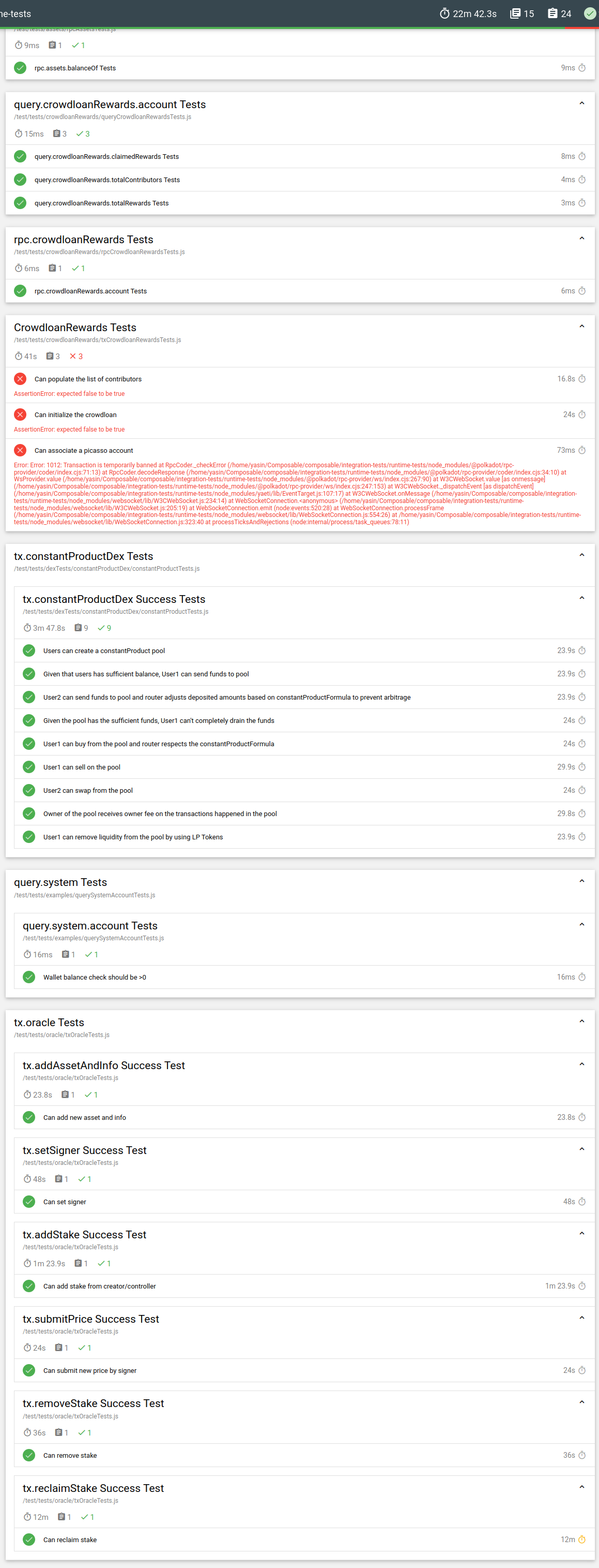 * [CU-200y9ka] Auction: generate a file with weights (#470) * CU-200y9ka - Auction: generate a file with weights * Make clippy happier * Fix tests * Add remark check in CI (#220) * Add remark check in CI * Add a config file for remark * Update config of CI * Make remark happier * Revert crowdloan bench (#485) * refactor crowdloan benchmarking * revert benchmarking integration of crowdloan rewards * CU-1uq4a7x - ValidateUnsigned instead of SignedExtension in Crowdloan (#486) * move crowdloan from SignedExtension to ValidateUnsigned * revert transaction version upgrade as we removed the SignedExtra * Check including wasm build (#489) * Check including wasm build * Add std feature check * remove actions-rs from test step (#490) * CU-1ubvcrq - introduce `Validated` and `Validate` for custom codec validation (#492) * introduce `Validated` and `Validate` for custom codec validation * add missing Deref/AsRef, use WrapperTypeEncode and introduce `And` * devnet (#427) * devnet release * Build everything * Use self hosted runners * use pre-installed cargo Co-authored-by: Karel L. Kubat <[email protected]> * Fix devnet deployment (#502) * fix * only on main * CU-1wty9p0 oracle api clarification (#462) * oracle api clarification Signed-off-by: Dzmitry Lahoda <[email protected]> * fixing pr comments Signed-off-by: Dzmitry Lahoda <[email protected]> * fixed comment Signed-off-by: Dzmitry Lahoda <[email protected]> * crazy fmt issue Signed-off-by: Dzmitry Lahoda <[email protected]> * just something to tirgget build after fail Signed-off-by: Dzmitry Lahoda <[email protected]> * fixed price, added ratio test Signed-off-by: Dzmitry Lahoda <[email protected]> * fixed comments Signed-off-by: Dzmitry Lahoda <[email protected]> * docs(Updated local devnet run information.): (#505) Removed "--features develop" flag from local build command instructions. Signed-off-by: Dominik Roth <[email protected]> * CU-1yykjpw Fix calc_utilization_ratio() and add proptest for it. * CU-1u5ykup - add generated types and refactor, add eth sign to crowdloan tests, bonded finance tests implementation (#487) * add generated types and refactor tests, add eth sign to crowdloan * Pulling bondPrice for bondedFinance Tests from variable * test(bondedFinance TX Tests, Added mocha config file, Cleanup.): (txBondedFinanceTests.ts): bondedFinance Extrinsic test implementation. (BondedFinance Pallet): MinReward now exposed through a constant query. (queryCrowdloanRewardsTests.ts): Updated checks and timeout. Following files have been removed, due to problems with the new type implementation. (queryTokenTests.ts): Removed Query Token Tests (Partial stub and stopped working) (querySystemAccountTests.ts): Removed Query System Account Tests (Stopped working) Added .mocharc.json configuration file. Cleanup Signed-off-by: Dominik Roth <[email protected]> * test(bondedFinance TX Tests, bondedFinance pallet, Runtime Tests ReadMe): (txBondedFinanceTests.ts): Moved test handlers into a folder to reduce the file length. Also added additional tests. (BondedFinance Pallet): In cancel function, set keep-alive of second Transfer function to false. Since clears the wallet of the staking account, and wasn't working therefore. (README.md): Changed timeout example to not show an infinite timeout. Added run information for the type generator. Signed-off-by: Dominik Roth <[email protected]> Co-authored-by: Dominik Roth <[email protected]> Co-authored-by: Dominik Roth <[email protected]> * Add Makefile.toml (#506) * Adds Benchmarking & Simnode (#497) * check_runtime workflow * check_runtime workflow * Updates weights for picasso-dev * update benchmark script * update benchmark script * support -> frame_support * Updates weights for picasso-dev * Updates weights for dali-dev * fix conflict * Add cargo.lock * fix runtime.sh * replace boldprint with echo * adds set_changes_trie_config to weights * adds set_changes_trie_config to weights * Updates weights for picasso-dev * hotpatch substrate * fmt & clippy * Updates weights for picasso-dev * Update simnode script * Update github workflow * Update github workflow * Updates weights for dali-dev * Update github workflow * Update github workflow * Updates weights for composable-dev * Add condition to ignore check_runtime on draft PR * fmt * adds +nighly to checks * add git pull * Finalizing cleanup * Finalizing cleanup * fmt fixes * clippy fixes * use +nightly-2021-11-29 for fmt * Updates weights for picasso-dev Co-authored-by: Seun Lanlege <[email protected]> Co-authored-by: haroldsphinx <[email protected]> * CU-1wty1zv fixed lending (#484) * oracle api clarification Signed-off-by: Dzmitry Lahoda <[email protected]> * fixing pr comments Signed-off-by: Dzmitry Lahoda <[email protected]> * fixed comment Signed-off-by: Dzmitry Lahoda <[email protected]> * crazy fmt issue Signed-off-by: Dzmitry Lahoda <[email protected]> * just something to tirgget build after fail Signed-off-by: Dzmitry Lahoda <[email protected]> * fixed lending Signed-off-by: Dzmitry Lahoda <[email protected]> * fixed price, added ratio test Signed-off-by: Dzmitry Lahoda <[email protected]> * fixed comments of review Signed-off-by: Dzmitry Lahoda <[email protected]> * fixed comments Signed-off-by: Dzmitry Lahoda <[email protected]> * Update benchmark workflow (#510) * Update Makefile * Update release * Update * Updating release * Added runtime check * Consolidate all branches into main * Update check_runtime * update benchmark workflow * fix makefile * diff base branch * diff base branch * diff base branch * fix makefile * github.ref * i give up * show-current * use commit sha * fetch main branch * try again Co-authored-by: Seun Lanlege <[email protected]> * Add <Bytes> tag for polkadotjs signature in crowdloan (#514) The public polkadotjs api signRaw is wrapping the message in this tag. * [CU-2326a8t] Update benchmarks of pallet-dutch-auction (#512) * Update benchmarks of pallet-dutch-auction * Update benchmarks of pallet-dutch-auction * fix asset coun
