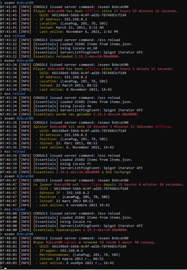 This PR now uses the Essentials' locale defined in its config file. Here are examples using en (default), en_GB (note change in date format from Month Day Year to Day Month Year and use of 24 hour time), de, fr, and ru. Only change between each example was changing the config's locale and doing ess reload. |