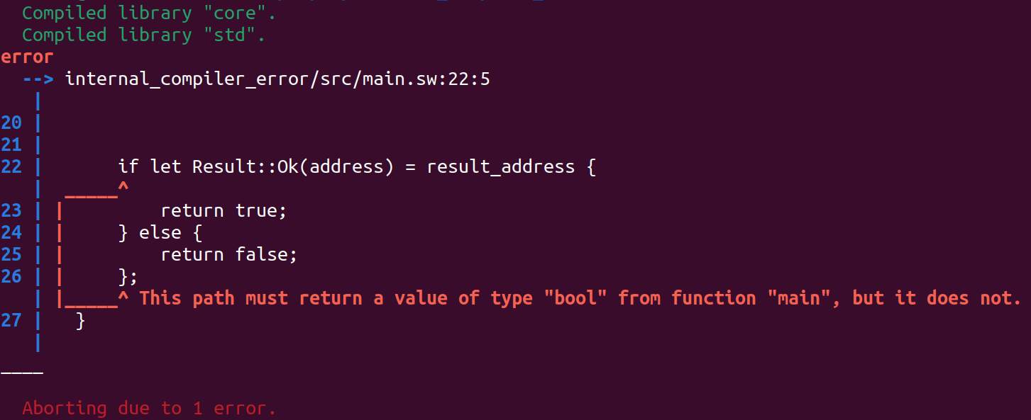 P: highShould be looked at if there are no critical issues leftShould be looked at if there are no critical issues leftbugSomething isn't workingSomething isn't workingcompiler: frontendEverything to do with type checking, control flow analysis, and everything between parsing and IRgenEverything to do with type checking, control flow analysis, and everything between parsing and IRgenteam:compilerCompiler TeamCompiler Team