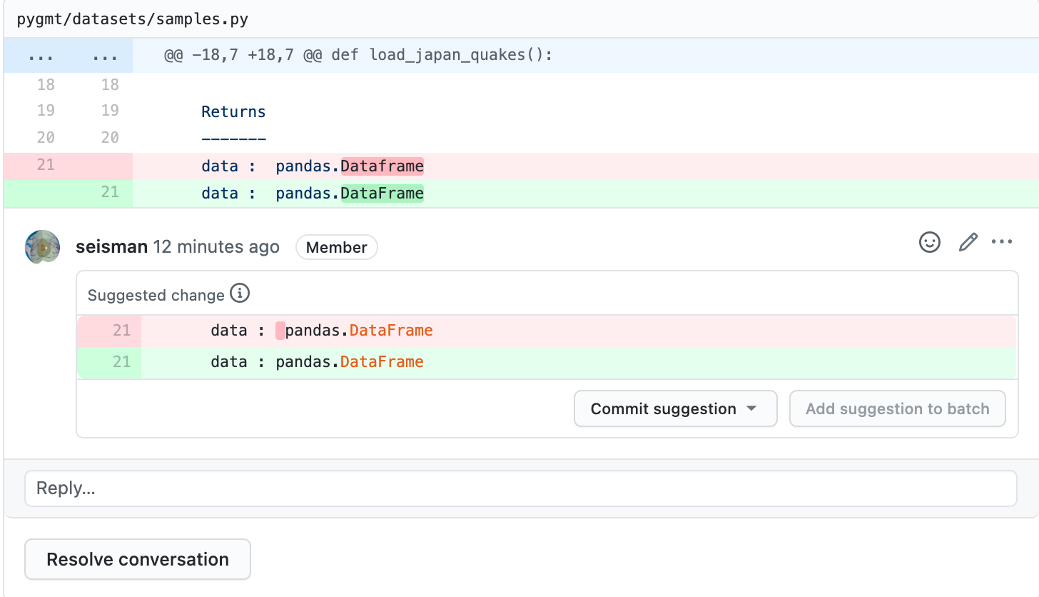 @seisman "Just a few tiny suggestions to remove the extra whitespace before pandas.DataFrame." |