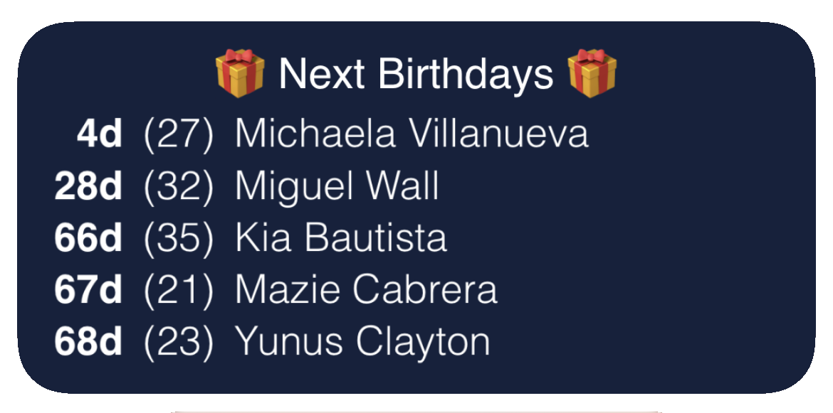 A small script displaying the next birthdays inside a iOS/iPadOS (stable) or macOS (beta) widget using the Scriptable app!