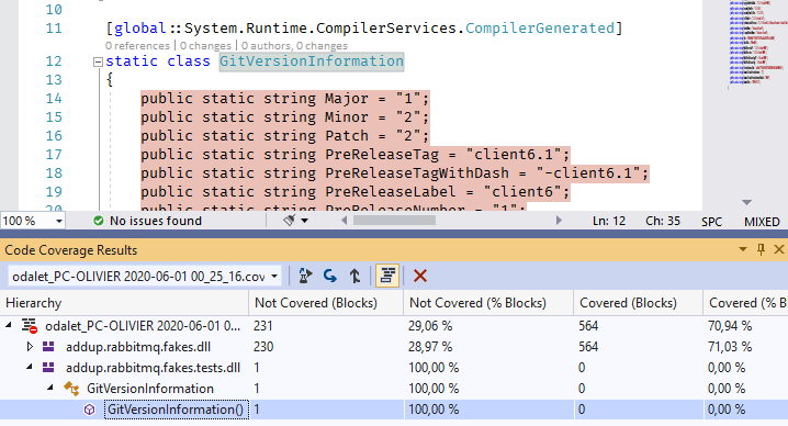 I use GitVersion through its MSBuild task. Yesterday by running "code coverage" from Visual Studio, I noticed, the generated GitVersionInformation class was considered as not covered code. Well, it's generated code and therefore It'd make sense for it not be part of the coverage statistics: