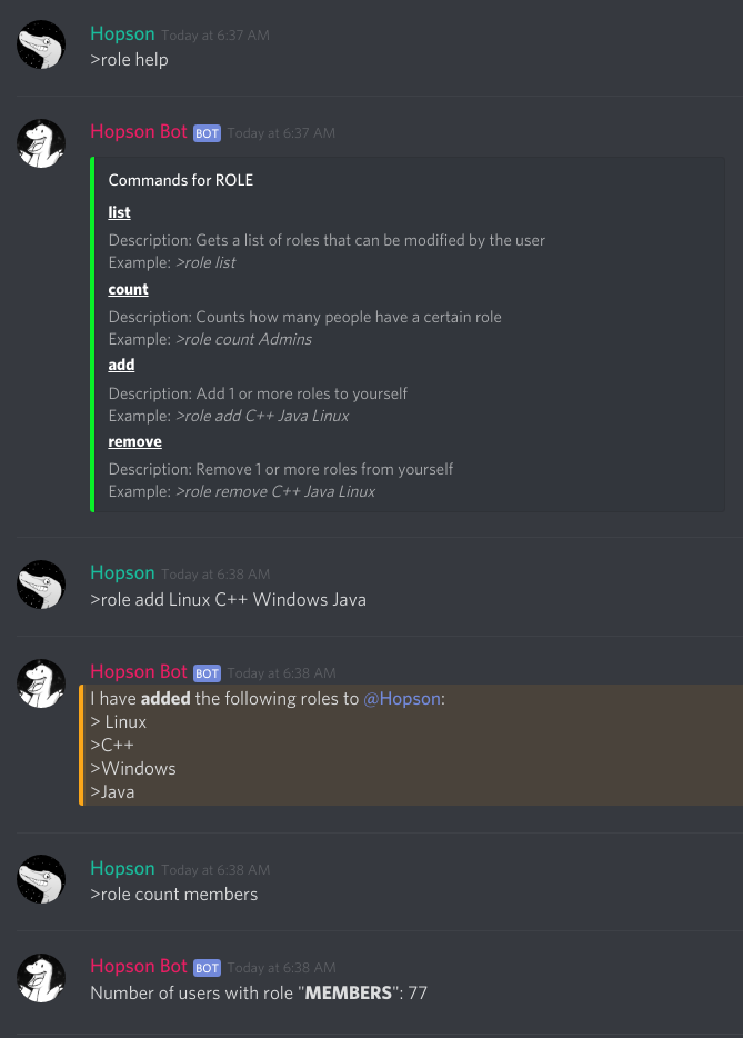Hopson Bot has commands split into multiple categories, which can be seen from the >help