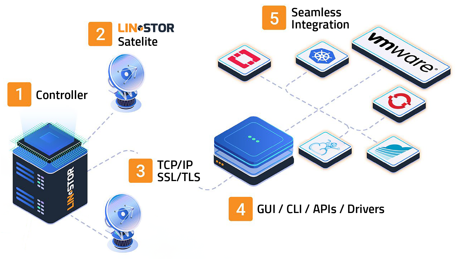 The storage system can be managed by directly using a command line client utility to interact with the active LINSTOR controller. Alternatively, users can integrate the LINSTOR system into the storage architecture of other software systems, such as Kubernetes, CloudStack, OpenNebula, or Proxmox VE. All communication between LINSTOR components uses LINSTOR's own network protocol, based on TCP/IP network connections.