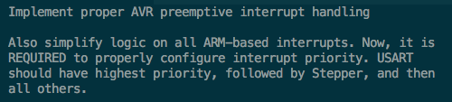 If there's some way to put the UART into a mode where it only interrupts when there's a definite need to prevent lost characters, that would be useful. Of course, on these faster processors the stepper ISR should be done a lot faster, so an interrupt in the middle of it will be less likely. And of course, the UART interrupt will also take up a lot less time… The main thing is, when the stepper ISR is running at top speed, we just don't want it monopolizing the MCU so that the UART cannot even get a character in edgewise. |