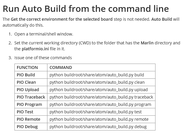Here's an excerpt from my proposed doc update. It's talking about AT90USB boards when using the PlatformIO CLI. One additional step is needed to use this method with the other AT90USB based boards that have CDC or DFU bootloaders. PlatformIO does not currently have a useable board definition for these board so Marlin has created a new board JSON. This JSON needs to be copied to a PlatformIO directory. Without it PlatformIO will issue an error message saying the board was not found. The file at90USB1286.json needs to end up in the directory .platformio/boards. The boards subdir may not exist under .platformio so the easiest method is to copy the boards subdir from the Marlin directory buildroot/share/PlatformIO to the .platformio directory Another method would be to run Auto Build from the command line: |