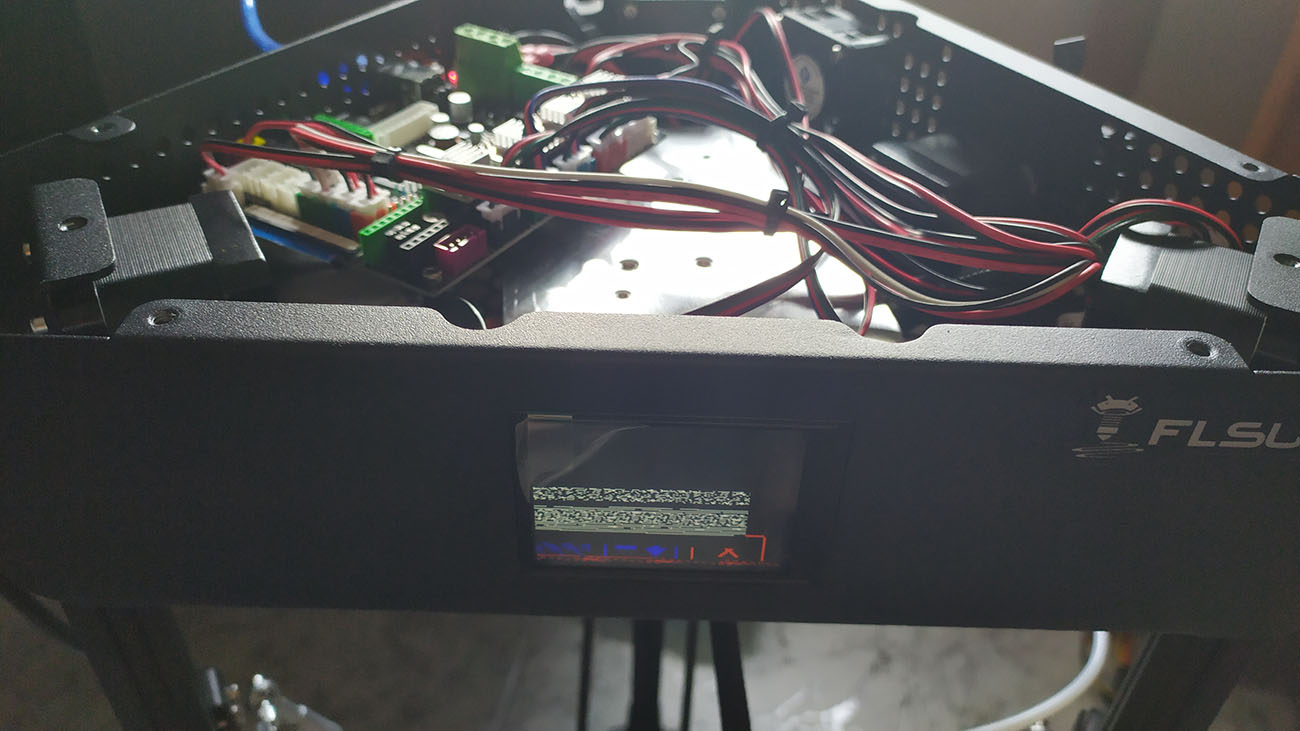 The green display seems to be slightly flickering. As if it was the wrong update frequency? Or maybe it's just more visible because it's green. Also, when turning the printer on I first get a green bar above the enter button. Without any text displayed, only the touch buttons. After a while the info screen appears. |