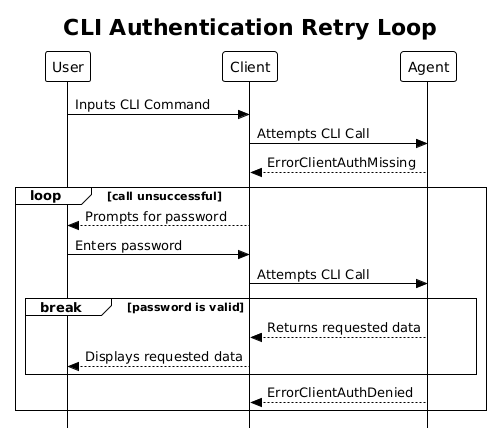When a user executes a CLI command without having been authenticated previously the command sent to the agent will be rejected as "unauthorised". Instead of throwing an exception here, we can prompt the user for the root password in order to authenticate the client. Provided we know that the user is not a machine (which would classify as unattended usage), we can continue to prompt the user for the root password until the correct password is supplied and they can be authenticated. We will refer to this loop as the CLI Authentication Retry Loop (CARL):