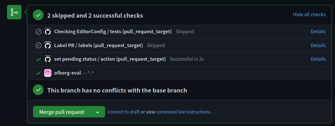 Wait for ofborg, make the contextofborg-evaland the description "Wait for OfBorg...". That way, the status will be reused by OfBorg when it starts evaluation and we don't need to clear it any more.Will this work?