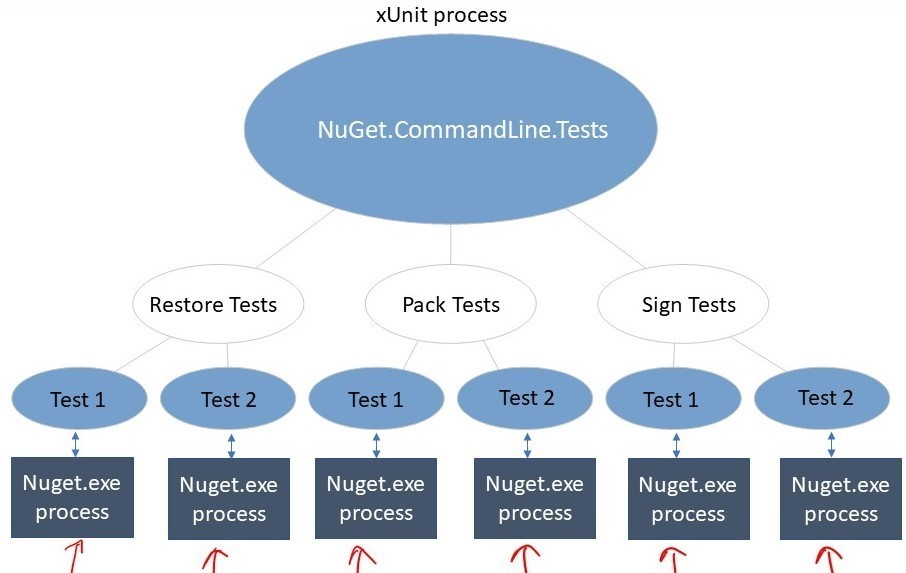 NuGet.CommandLine.Tests, every test in the test suite execute creates anuget.exeprocess as shown below. Everynuget.exeprocess executing test command publishesoutput and error streamto the parent process so that test can check the result to verify the test status.The way we read output and error stream from a Process while running tests in