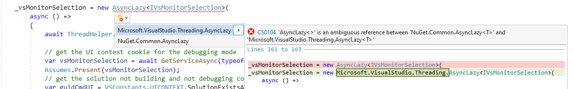 Reason I did it was if I import Nuget.Common then just 8-9 lines down on AsyncLazy<IVsMonitorSelection> needed exact same thing it needs fully qualified name. So instead of touching existing code for same change I tried to contain my changes.