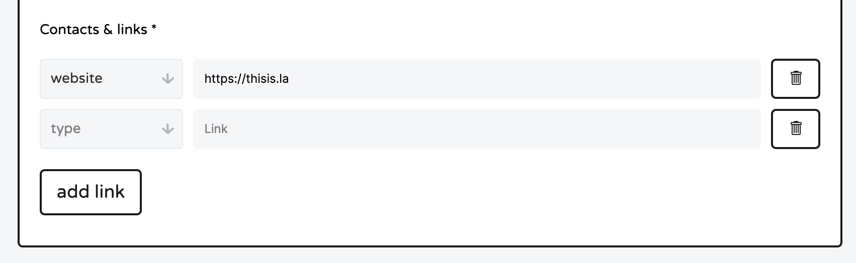 @davehakkens, updated so that the Delete button is only available if there are multiple fields available. There is only a single field available: There are multiple links added so any one can be removed. Although it is not possible to safe a profile using an empty value |