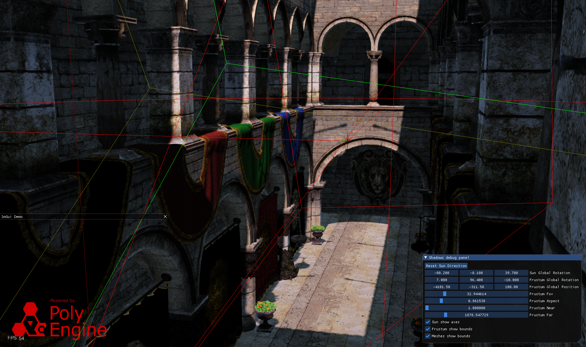 * test case * calculating light bounds in AABox around frustum in game example for debug * added tight projection around camera frustum, light projection near and far planes based on scene intersection and moving light in texel-sized increments * shadow bug dependent on camera direction * imgui reacting to input and drawing on screen from render device * proper init, render deinit and windows created by game * comments * comments * commented #pragma failing travis ci * removed #pragma * removed pragma from resource * commented unused components * commented out wrong variable doh... * prototype of shadow casters culling * moved code to rendering device, tested on example scene and on sponza, seems ok * added AABox around every drawn mesh and still fails on sponza * removed shadow casters AABox * stable shadows working on sponza and test scene * stable shadowmap * interpolated Percentage Closer Filtering * shadows prototype cleanup * shadow ramblings * merged with dev * cmake attempt * moved imgui to third parties, cmake updated for Engine, RenderingDevice and Game Project. Spams a lot * removed sanity spam * resource cleanup * imguisystem cleanup * imgui world component cleanup * added non windows API attributes to imconfig.h * moved imgui to pch * silencing third party gcc -Wimplicit-fallthrough= * enabled -fPIC (Position Independent Code) for imgui static lib to be included in shared libs * fixing gcc includes * fixing cgg includes * made includes same as in GLTextureDeviceProxy * removed commented out code * ImguiUpdate is now in System, Imgui context creation moved to ImguiSystem constructor, removed Resource and WorldComponent * moved Imgui to Engine subdirectory * Added clipboard support, tweaked mouse handling and input that can be consumed by any system * added UTF8 char input from keyboard keys * fixing input consumption (works on all widowns: engine and game) * added output queue and events handled by SDL * CI fix * CI fix and cleanup * CI fix * CI fix * fix * Moved getting axis vector from MovementSystem to EntityTransform * shadowmap ortho projection has correct direction based on dir light forward vector * shadowmap projection in [0, 1] range * stable shadows on frustum transform and properties change * shadows prototype with tight bound around frustum and ortho projection in [0, 1] on Z * more changes * tweaks to AABB intersection tests * added tweakable shadow bias and glPolygonOffset * working evsm2 and evsm4 * shadow projection working with shadow bounds extended by vertical shadow casters * some EVSM4 shadows that work * created pass with shadowmap * switched renderer to use Shadommap pass * parametrizing shadow types * EVSM2 seems to work as well * removed debug light parameters, shadowmap pass has pcf and evsm versions * removed debug variables from light and camera components * CI fix * CI fix * CI fix * CI fix * CI Fix * debug rendering cleanup * cleanup and comments * cleanup * compilation fix * cleanup * cleanup * ignore shader dump extension * fix * Added comment for .dump file extention * cleanup * AABB unit tests * CI fix, tabbed documents * CI fix, tabbed documents * review fix, tabbed code * assert and nullptr fix * None RenderingSettingsComponent fix * review fix * review fix, updated includes * review fix, removed commented code * magic variable moved to constant * CI fix * CI fix