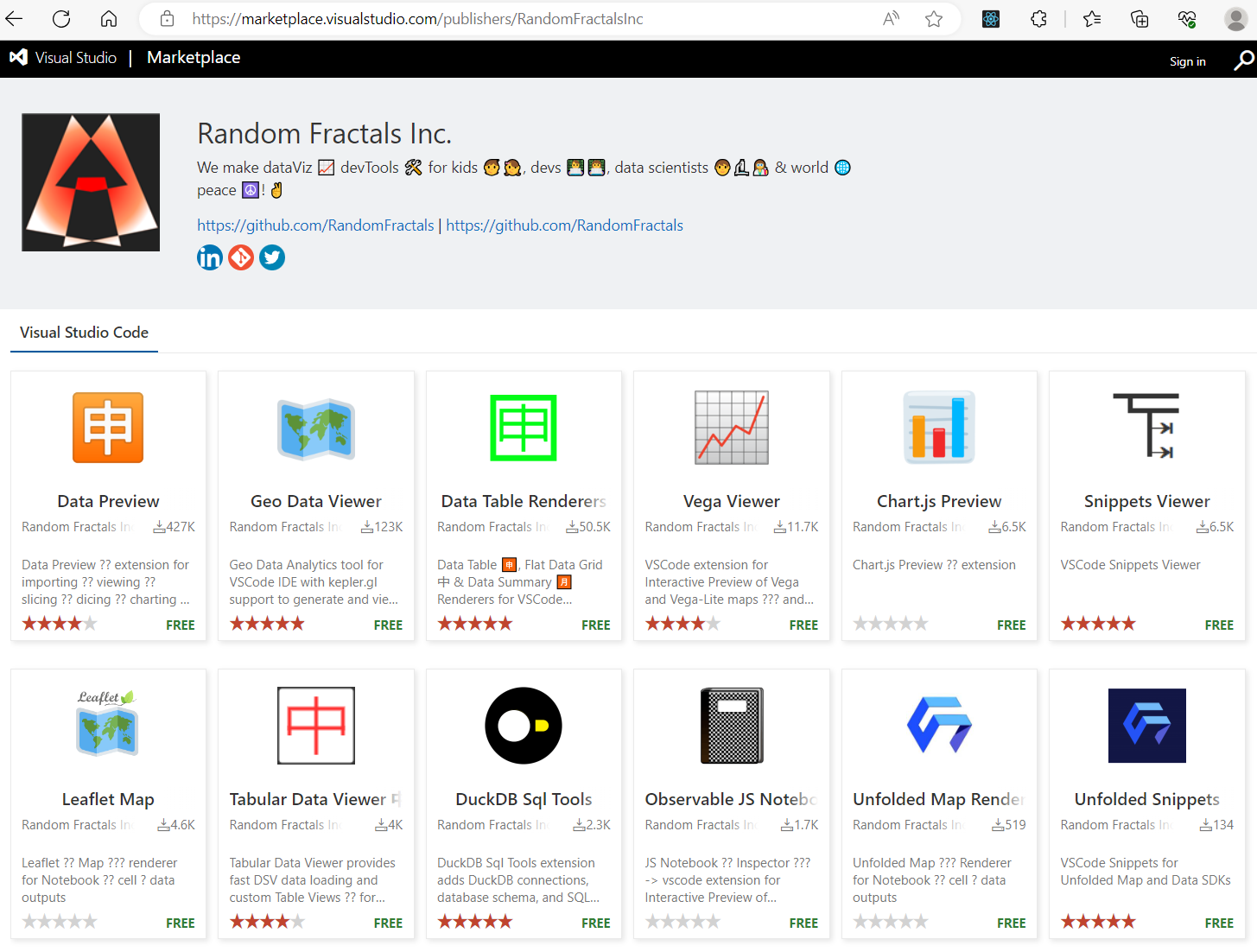 Random Fractals Inc. Data Tools 🛠️ is a collection of public data visualization extensions, data viewers, VS Code Notebook renderers, and code snippets for devs and data scientists using VS Code IDE, published under our Random Fractals Inc. ☂️ org.
