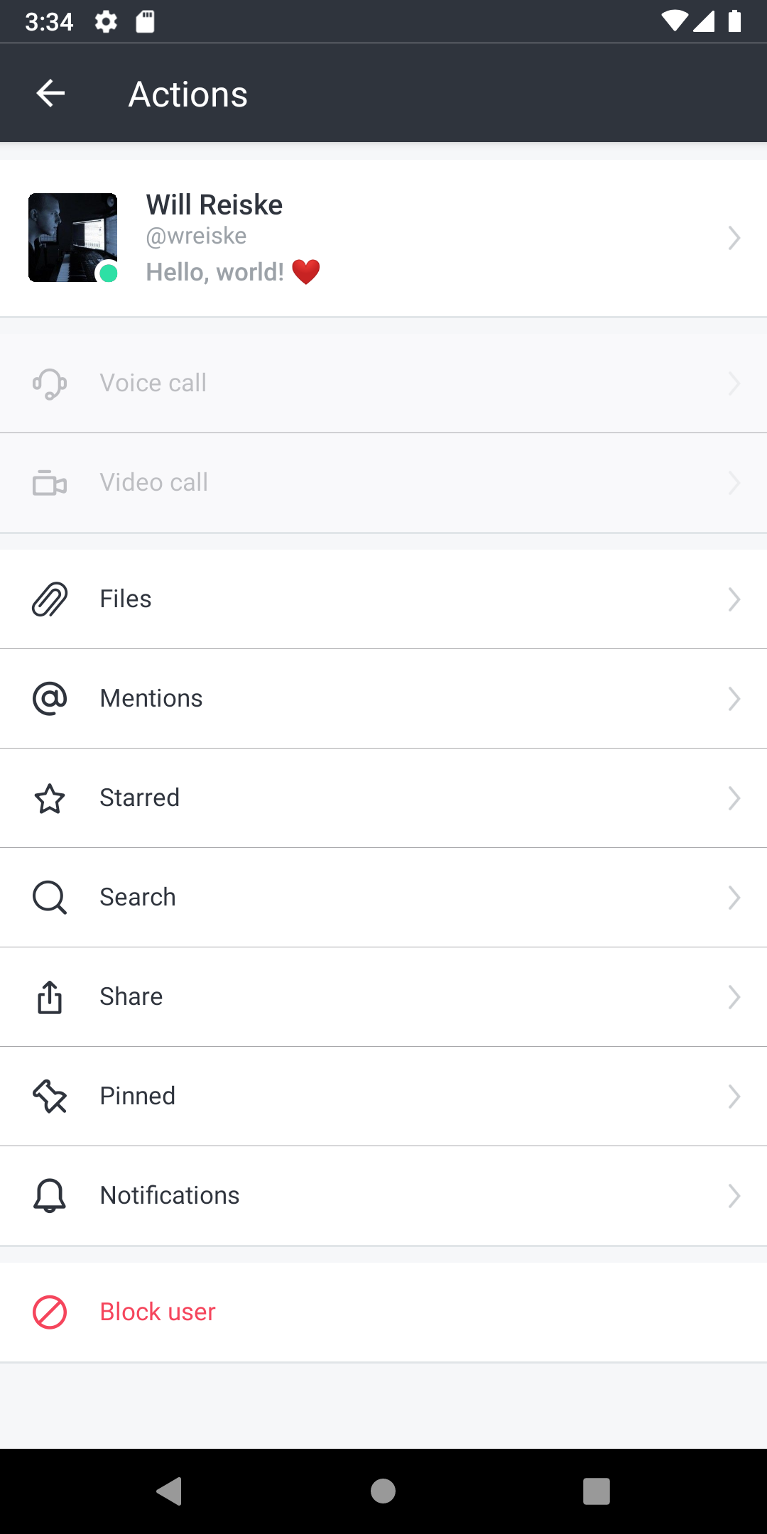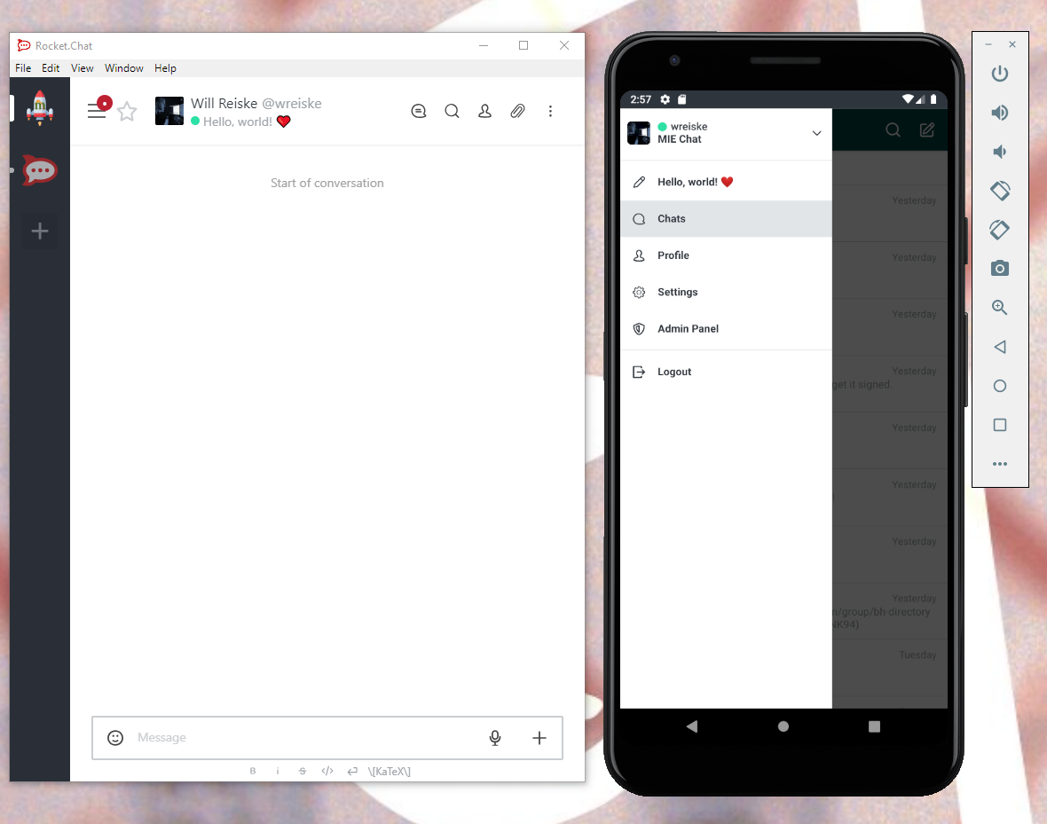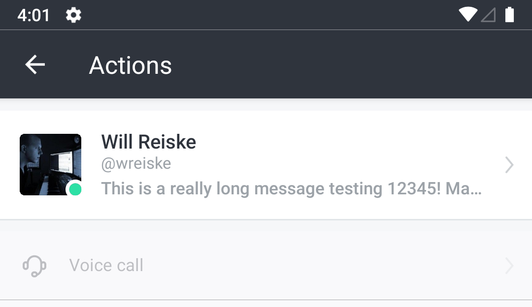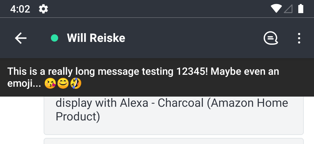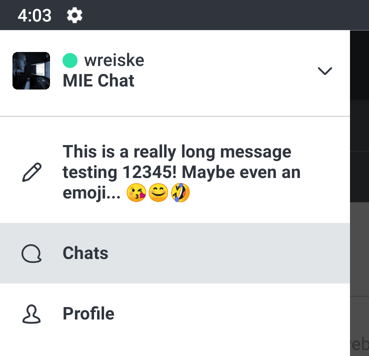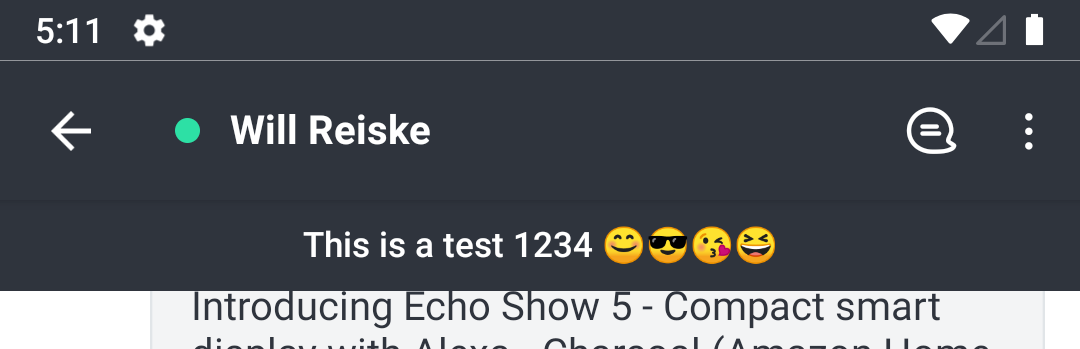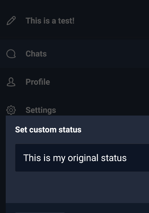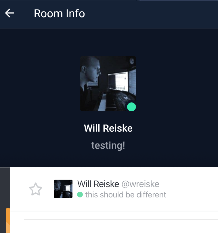Also, the original bugs still exist... The status message does not refresh in the mobile app when changed on desktop. You have to click out of the room and click back in to see the change. It also looks like this introduced some bugs. When there is no status message, the status bar shouldn't be displayed in a DM. The status also doesn't refresh in the user profile: Thanks for all the help! |