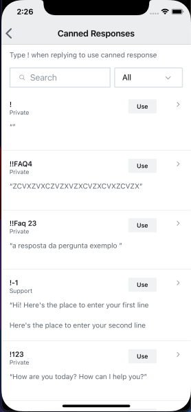 So, here is implemented the feature to get the canned response from input message in room view [Screenshot 1], besides that the agent can see all the canned responses, filter by text and departments in a new view [Screenshot 2], added a new view to see the canned response in detail [Screenshot 3].