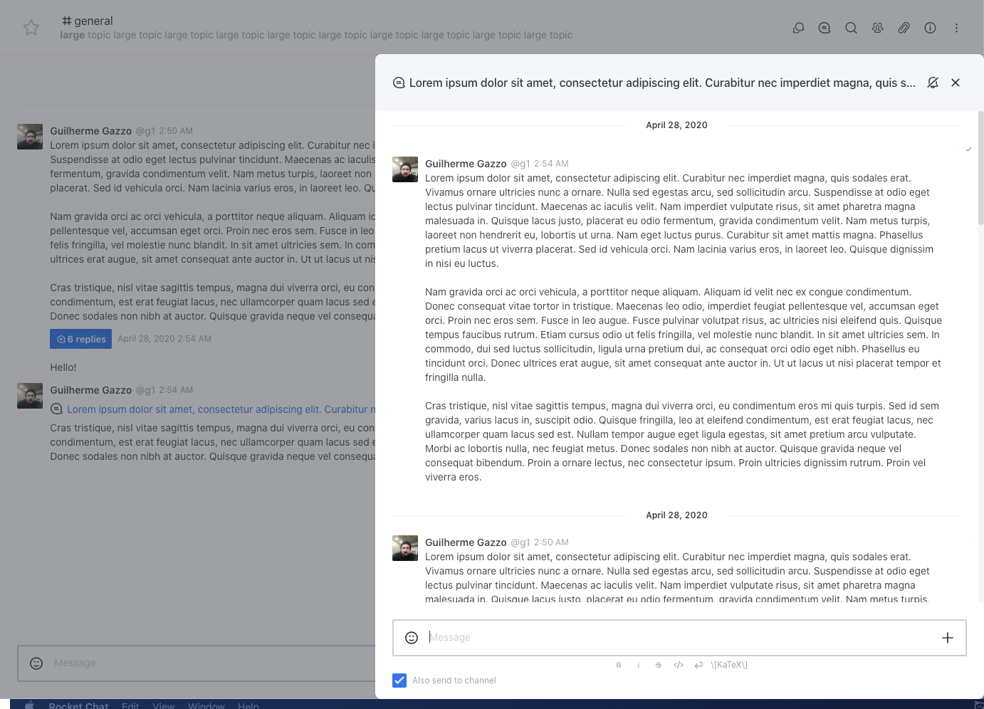 hey @reetp sorry for the delay, but I think you got (or I explained) it wrong... the personal setting and the checkbox are different things... the personal setting was designed to allow users to keep the old thread experience (keeping all the messages in the main thread)... the second one, is for the new design which omits the ordinary conversations from the main thread, and you choose if you want to send in the main channel if it's so important... actually we have plans to remove the personal setting and hide the ordinary messages from the main thread (its an option to give more time to users get used with the new style)... |