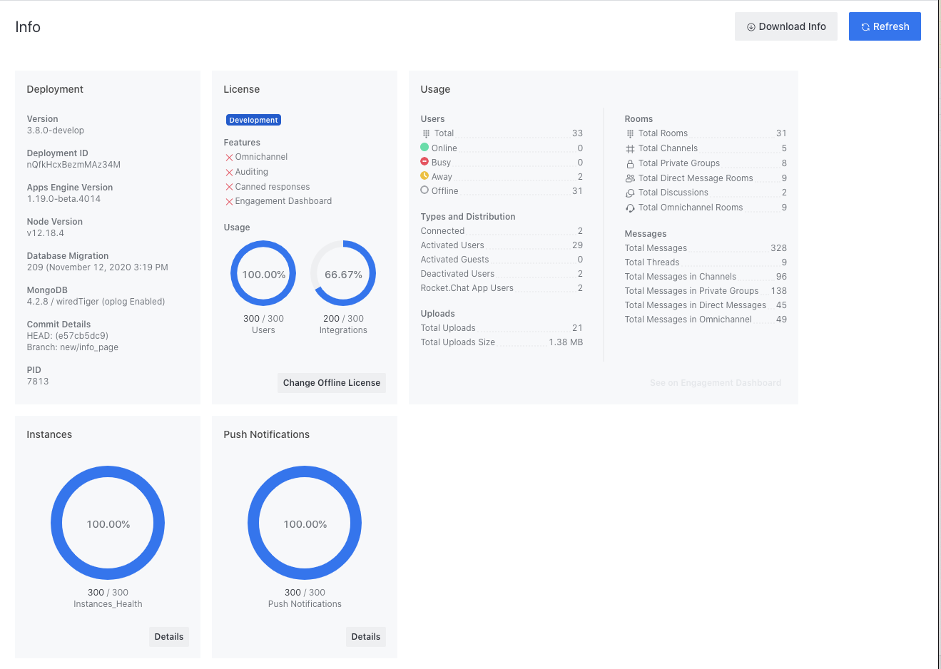 …info_page * 'develop' of github.com:RocketChat/Rocket.Chat: (255 commits) Chore: Add tests for the api/licenses.* endpoints (#20041) Language update from LingoHub 🤖 on 2021-01-04Z (#20034) [FIX] Omnichannel Agents unable to take new chats in the queue (#20022) [FIX] Omnichannel Business Hours form is not being rendered (#20007) Language update from LingoHub 🤖 (#20013) Chore: Fix i18n duplicated keys (#19998) [FIX] Agent information panel not rendering (#19965) [FIX] Apps Create Room method with agent not working (#19997) Chore: add tests to api/instances.get endpoint (#19988) Bump version to 3.11.0-develop Bump version to 3.10.0 Bump version to 3.10.0-rc.4 Bump version to 3.10.0-rc.3 Bump version to 3.10.0-rc.2 Bump version to 3.10.0-rc.1 Bump version to 3.10.0-rc.0 Revert "[NEW] Storj integration (#19932)" Regression: polishing licenses endpoints (#19981) Regression: Double Scrollbars on tables (#19980) Regression: Add currently running instance to instances.get endpoint (#19955) ...