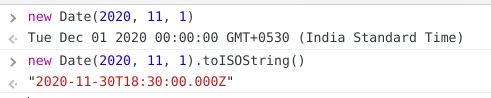 • Earlier when we were using date.toISOString(), under my timezone it was converting start of the month incorrectly. I expected it to be 1st December however it converts it to 30st November. Please have a look in the below console