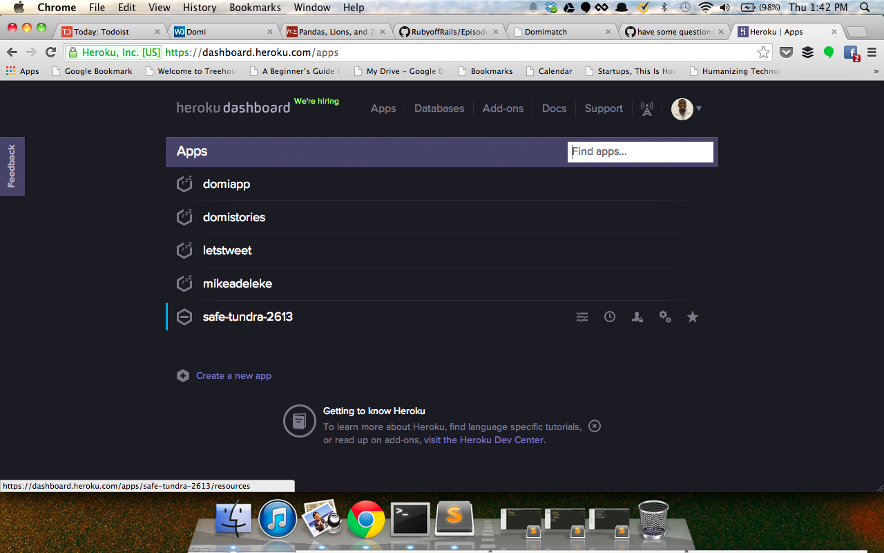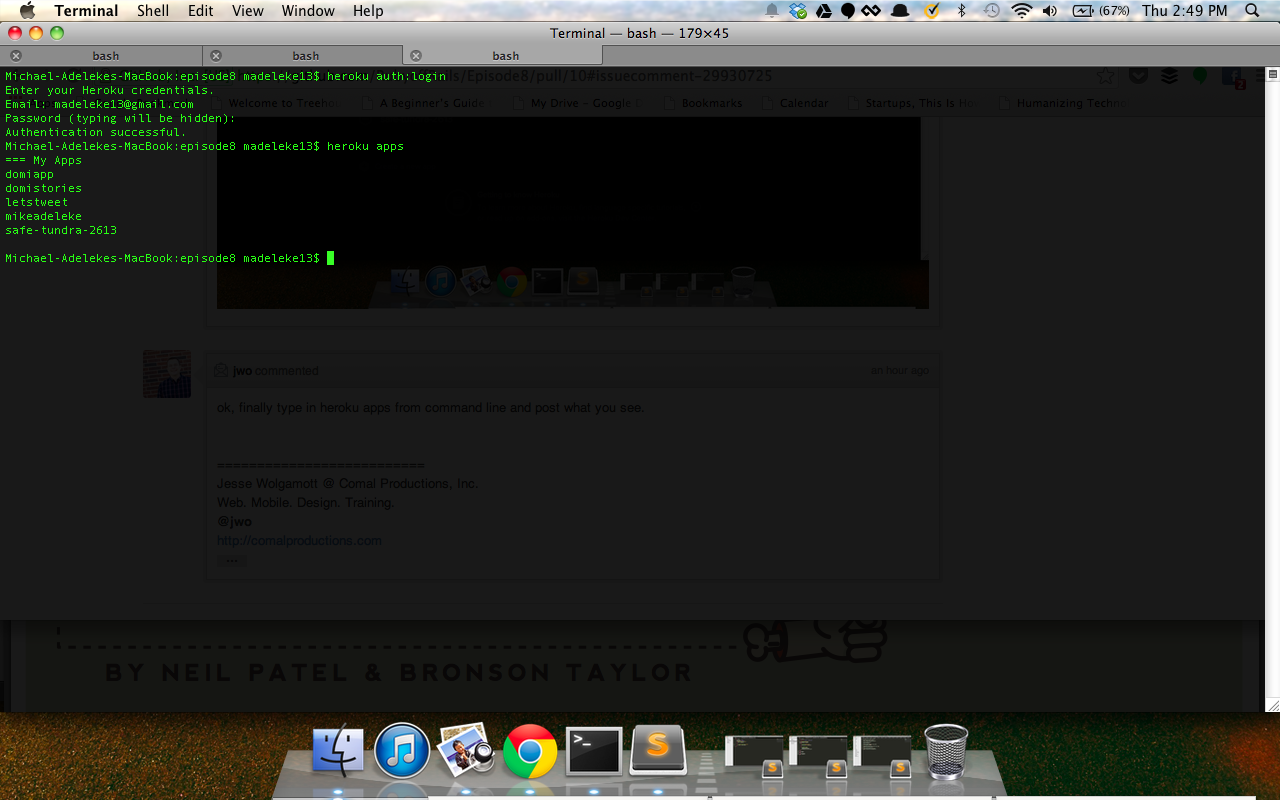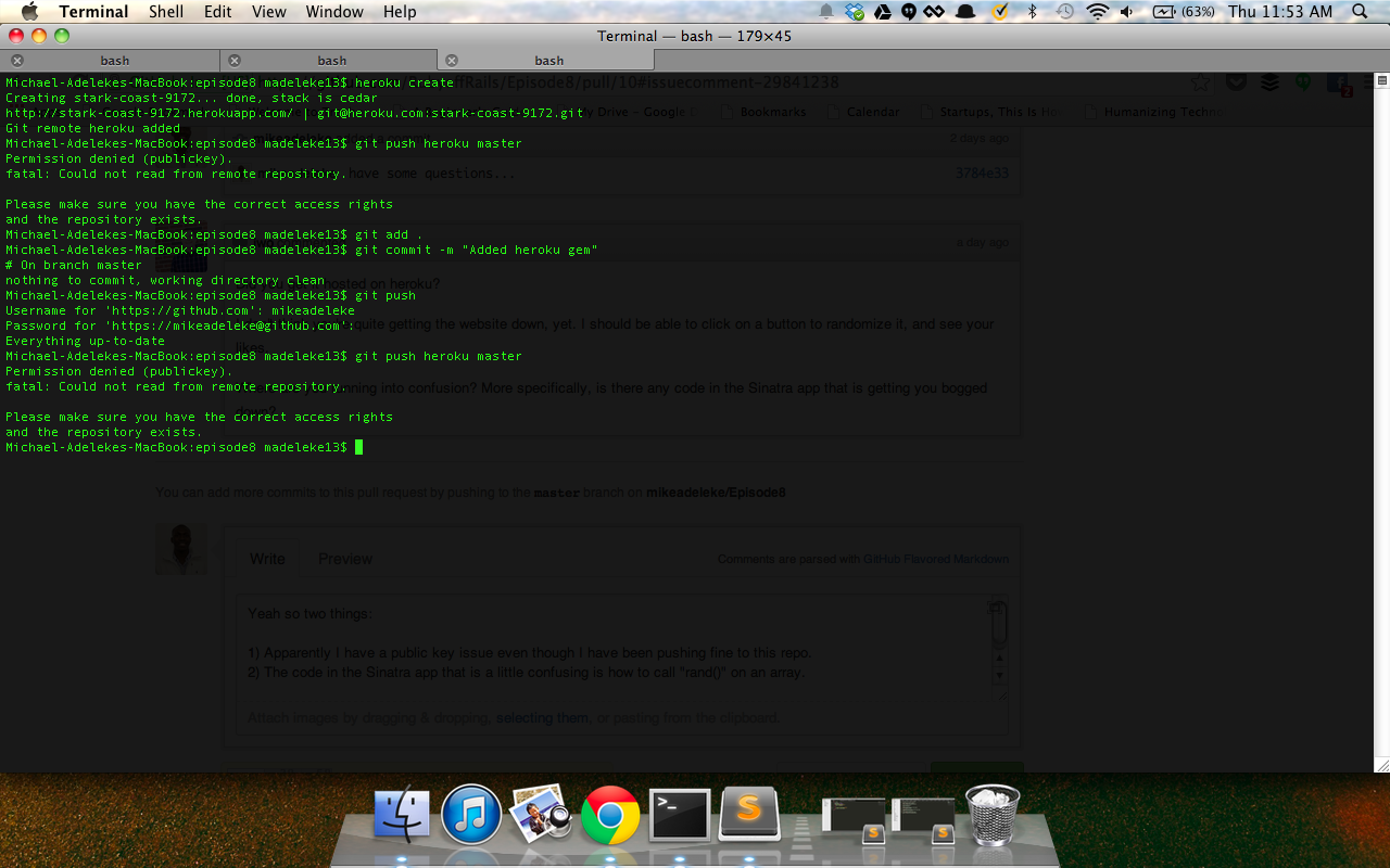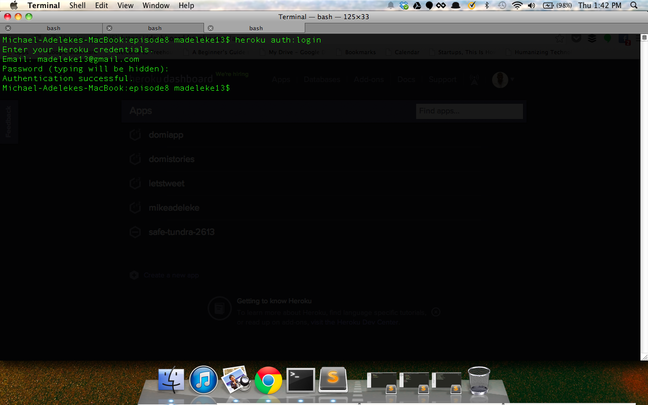 ok, finally type in heroku apps from command line and post what you see. Jesse Wolgamott @ Comal Productions, Inc. On Thursday, December 5, 2013 at 1:43 PM, Mike Adeleke wrote:
