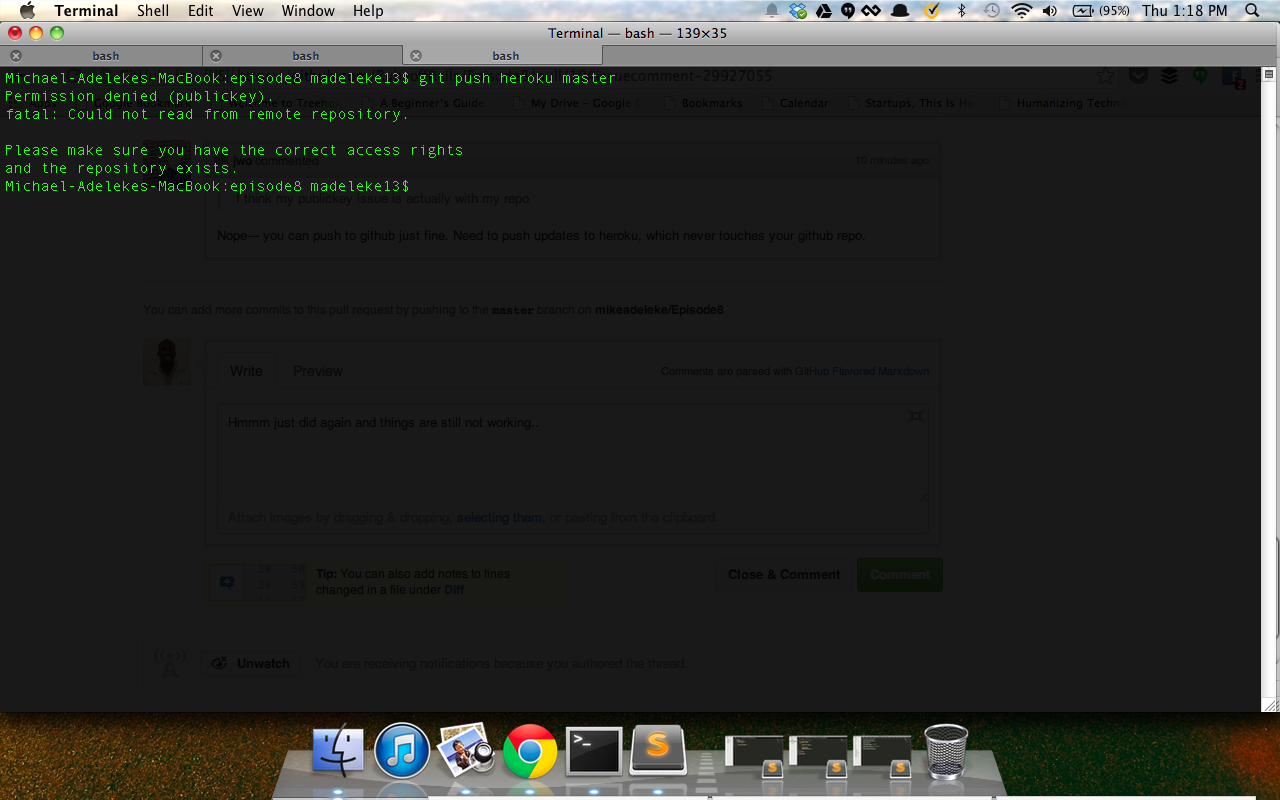 Likely your ssh key is linked to the wrong user. maybe? possibly? Jesse Wolgamott @ Comal Productions, Inc. On Monday, December 9, 2013 at 12:52 PM, Mike Adeleke wrote: