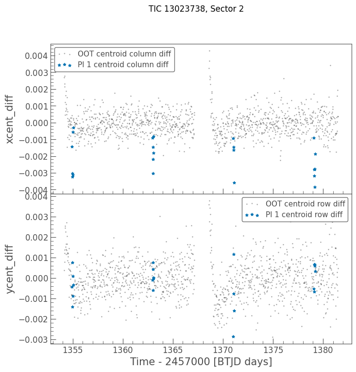 p-values, to using the minimum of X and Yp-values.E.g., for TIC 13023738, sector 2 referenced in the associated paper, the diagnostics could help to pinpoint the X / column centroids have a noticeable shift: