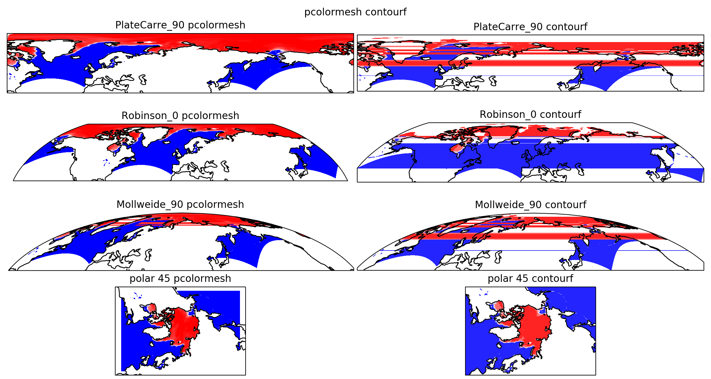 The left plots are pcolormesh which includes the patch for overlapping cells, the right plots are contourf and displays many overlapping cells.
