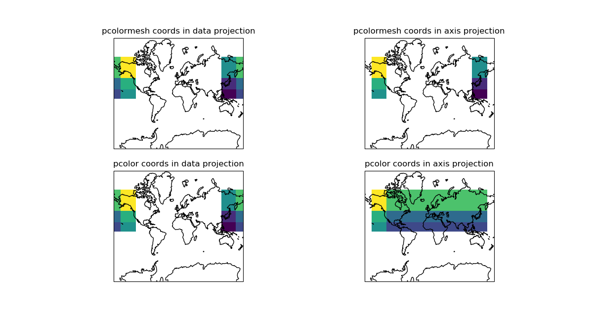 This PR is closed because taken into account by #1467 After further analysis and using both my example (ice data in stereographic projection) and the example above, I came to the conclusion that pcolor was failing to plot the overlapping cells when the data coordinates were given in the axis projection. Here is the code to used to show that point. Here is a very simple example with big cells showing how it works. |